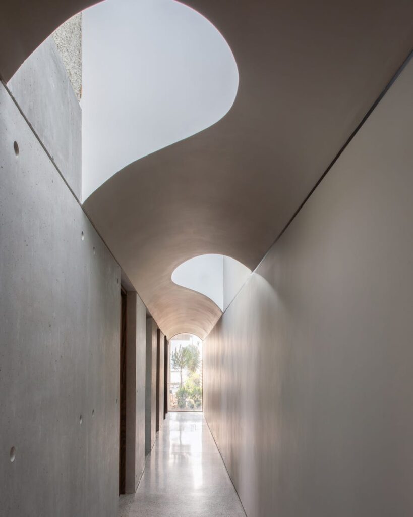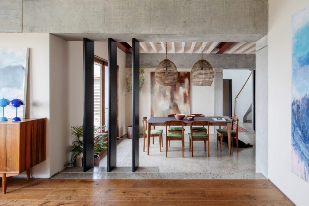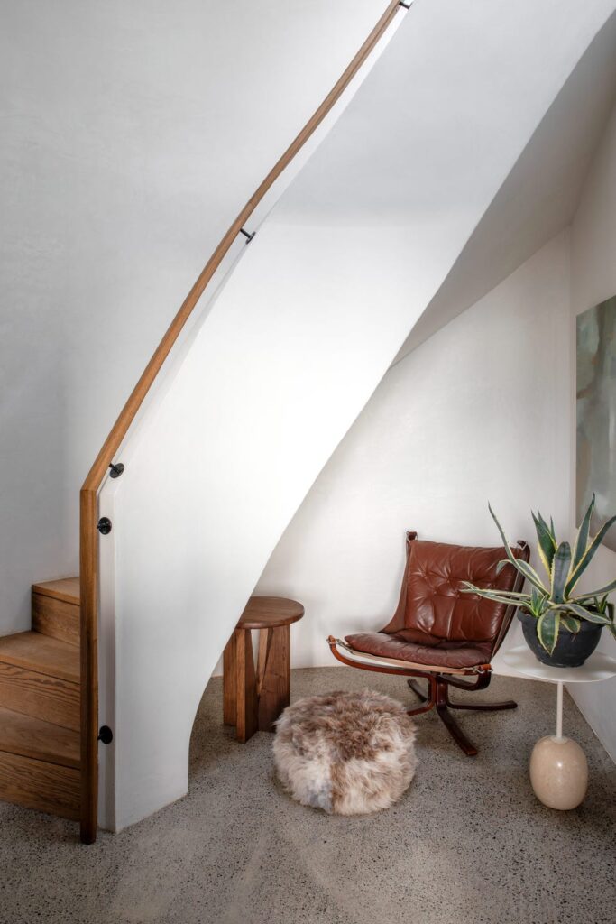 Εξασφαλίζοντας μια αίσθηση συνέχειας, το σκυρόδεμα εκτείνεται στον χώρο διαβίωσης, όπου η εντύπωσή του μαλακώνεται από γυαλί και ξύλο – υλικά που προτιμούν ο Gareth και η Caroline για την ικανότητά τους να δημιουργούν μια υποσυνείδητη αίσθηση ηρεμίας. «Όταν μπήκα, το σπίτι ήταν αρχιτεκτονικά σύγχρονο, και ο πελάτης ήθελε να εισαγάγω παιχνιδιάρικα στοιχεία διατηρώντας παράλληλα μέρος του αρχικού του χαρακτήρα» λέει η Caroline. Ένα περσικό χαλί, που θυμάται με αγάπη ο πελάτης από την παιδική του ηλικία, τοποθετήθηκε μπροστά από τη νέα γλυπτική σκάλα. «Μου αρέσει η αντιπαράθεση – ενώ το παράθυρο του κόλπου καμπυλώνει, η σκάλα βλέπει προς τα μέσα» συμπληρώνει ο Gareth.