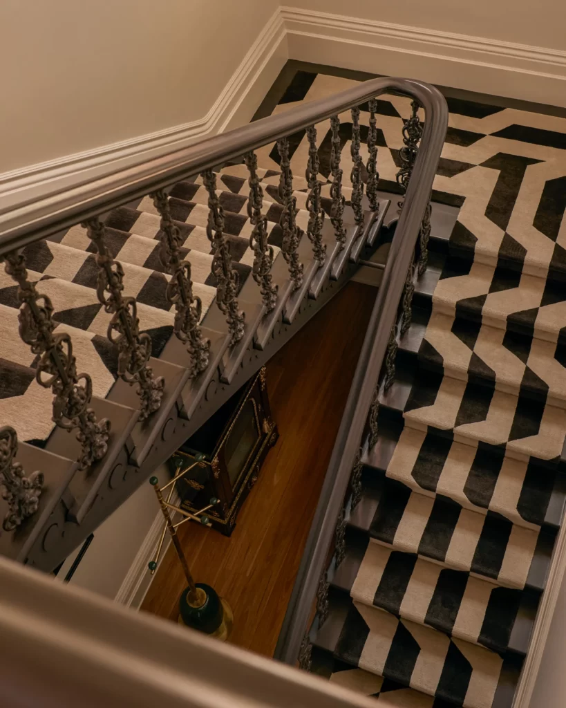 «Λοιπόν, υπάρχει πολύ βαρύ ξύλο – πατώματα και οροφές – οπότε το μαλακώσουμε με τα χαλιά, τις κουρτίνες και τη χρήση διαφορετικού υφάσματος για κάθε καρέκλα» λέει η Simone. «Και, φυσικά, το γραφικό χαλί με το οποίο καλύψαμε τη σκάλα».