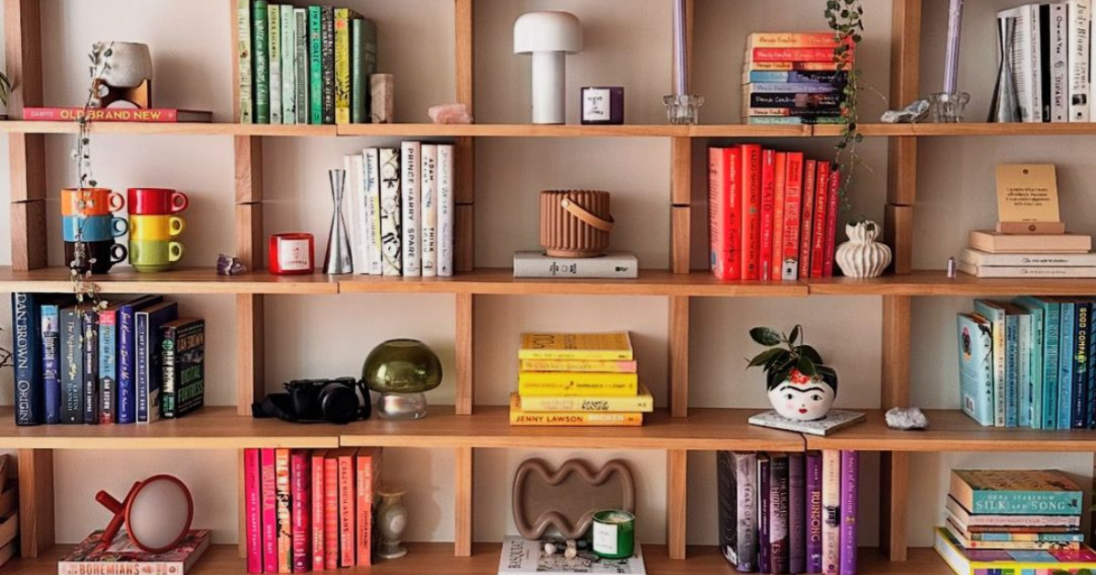 Η πιο κάτω εικόνα παρουσιάζει μια μεγάλη, ανοιχτή βιβλιοθήκη, με ράφια συμμετρικά οργανωμένα. Τα βιβλία είναι τοποθετημένα τόσο κάθετα όσο και οριζόντια, δημιουργώντας οπτική ποικιλία. Ανάμεσα στα βιβλία υπάρχουν φυτά εσωτερικού χώρου που κρέμονται βρίσκονται σε γλάστρες, καθώς και διακοσμητικά αντικείμενα όπως κεραμικά, μικρά φωτιστικά, κεριά και καλλιτεχνικά στοιχεία. Η χρωματική παλέτα των βιβλίων και των αντικειμένων είναι προσεκτικά ισορροπημένη, με αποχρώσεις που εναλλάσσονται αρμονικά και δίνουν έναν αισθητικά ευχάριστο χαρακτήρα στον χώρο. Η παρουσία φυτών στο δάπεδο ενισχύει την αίσθηση φυσικότητας και ζωντάνιας, ενώ το συνολικό αποτέλεσμα αποπνέει τάξη χωρίς να φαίνεται αυστηρό ή ψυχρό. Πρόκειται για έναν χώρο που συνδυάζει την πρακτικότητα με την προσωπική έκφραση.
