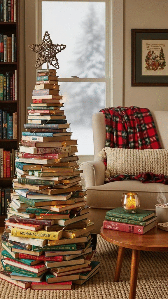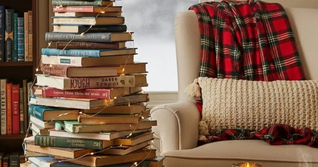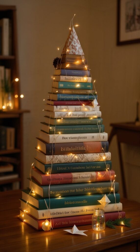 Η ιδέα ενός χριστουγεννιάτικου δέντρου από στοιβαγμένα βιβλία είναι μια δημιουργική και ιδιαίτερα συμβολική πρόταση διακόσμησης. Αντί για το παραδοσιακό δέντρο, τα βιβλία τοποθετούνται το ένα πάνω στο άλλο, ξεκινώντας από τα μεγαλύτερα στη βάση και καταλήγοντας στα μικρότερα στην κορυφή, σχηματίζοντας το τριγωνικό σχήμα του δέντρου.