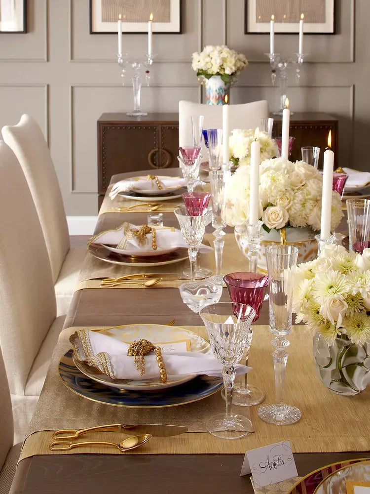 «Λατρεύω να υιοθετώ την τέχνη του συνδυασμού ασημένιου και χρυσού» λέει η ειδικός ψυχαγωγίας και ιδρύτρια του ομώνυμου καταστήματος lifestyle, Kim Seybert. «Σκεφτείτε επιχρυσωμένα σουπλά σε συνδυασμό με λαμπερές λεπτομέρειες, για να δημιουργήσετε ένα τραπέζι που δίνει μια πλούσια και αβίαστα κομψή αίσθηση». Διατηρήστε το υπόλοιπο τραπέζι ουδέτερο – σκεφτείτε τα καθαρά λευκά είδη και τα ντελικάτα σερβίτσια για να επιτρέψετε στα μεταλλικά στοιχεία να λάμψουν πραγματικά».