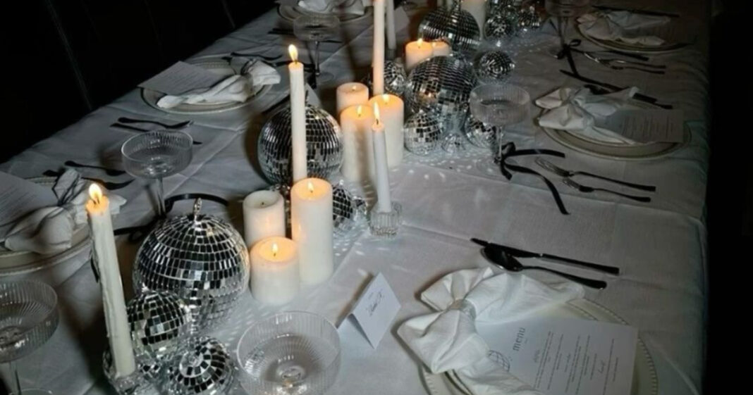 Η φωτογραφία αποτυπώνει μια κομψή και ατμοσφαιρική διακόσμηση τραπεζιού, ιδανική για ρεβεγιόν παραμονής Πρωτοχρονιάς. Η βάση είναι ένα λευκό τραπεζομάντηλο που δίνει αίσθηση καθαρότητας και πολυτέλειας, επιτρέποντας στα διακοσμητικά στοιχεία να ξεχωρίσουν χωρίς υπερβολές. Στο κέντρο του τραπεζιού κυριαρχούν λευκά κεριά σε διαφορετικά ύψη, τοποθετημένα σε γυάλινες βάσεις. Ανάμεσά τους υπάρχουν μικρές και μεγαλύτερες ασημένιες disco μπάλες, που αντανακλούν το φως και προσθέτουν μια παιχνιδιάρικη, πρωτοχρονιάτικη λάμψη. Το σερβίτσιο είναι προσεγμένο και συμμετρικά τοποθετημένο, με λευκά πιάτα με υφασμάτινες πετσέτες διπλωμένες με κομψό τρόπο να ενισχύουν το minimal ύφος.