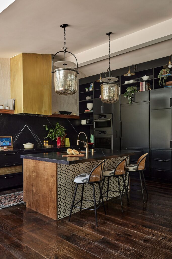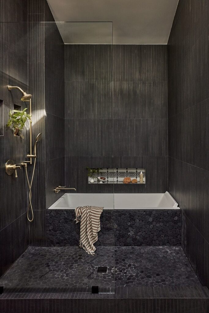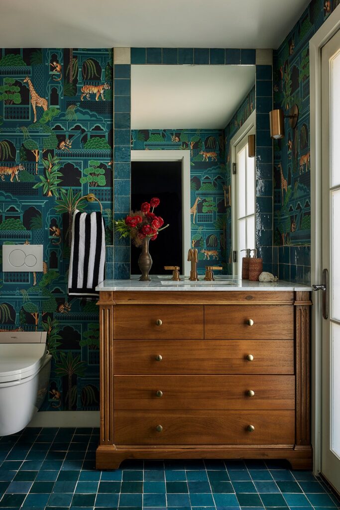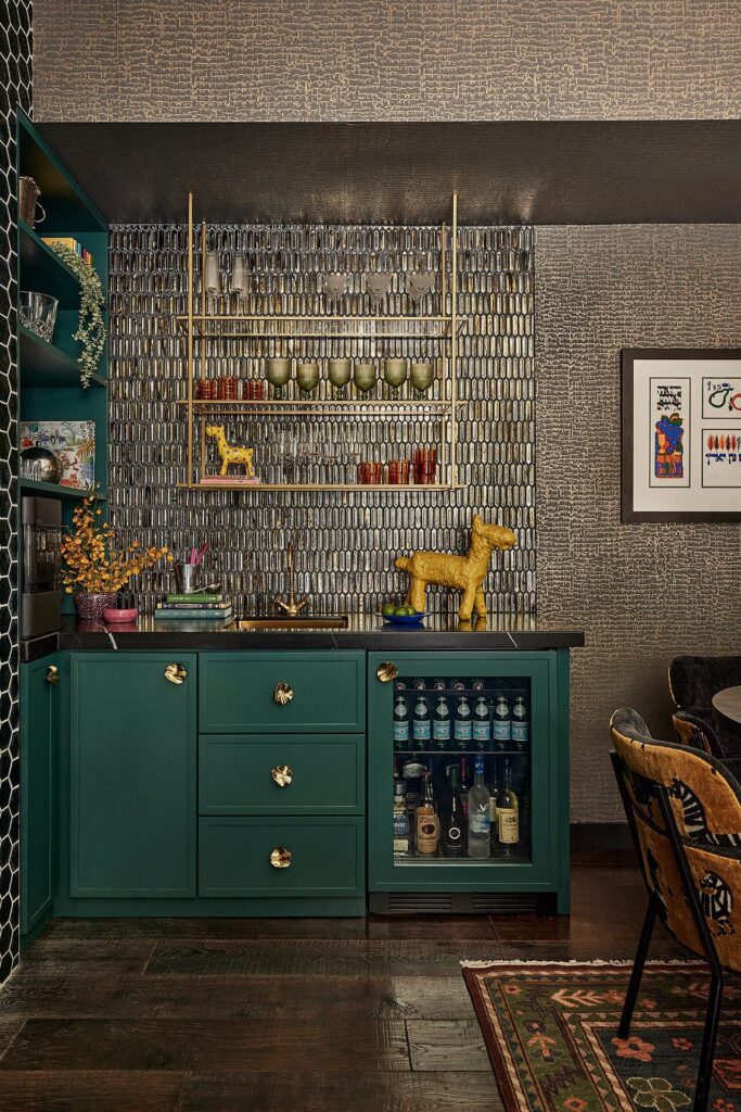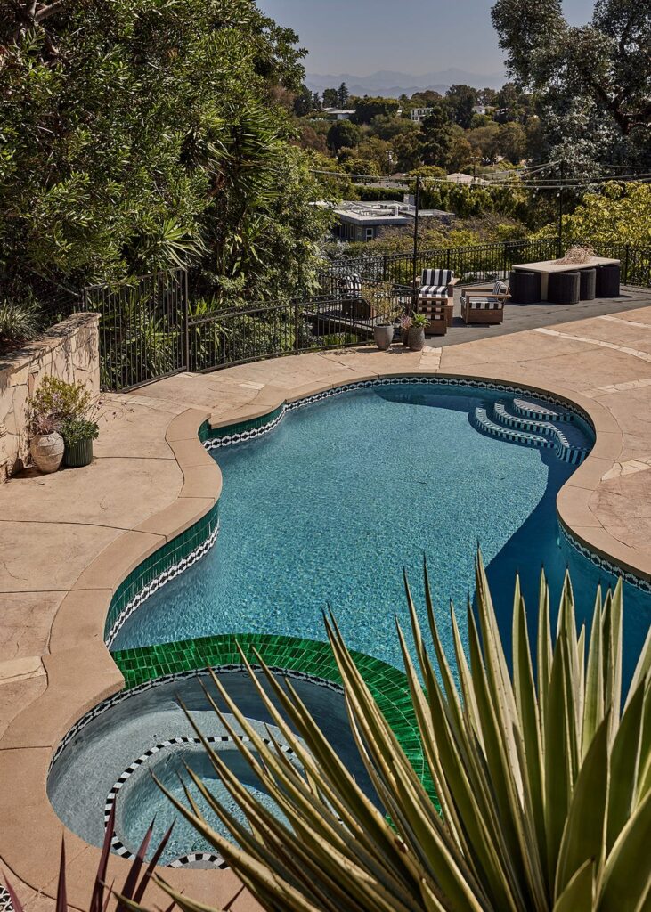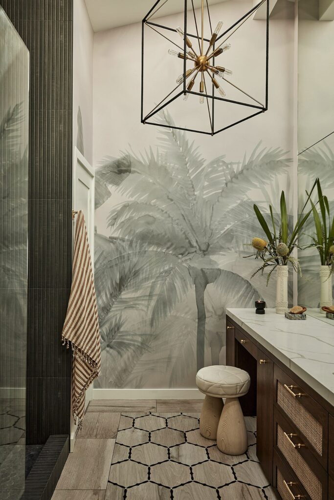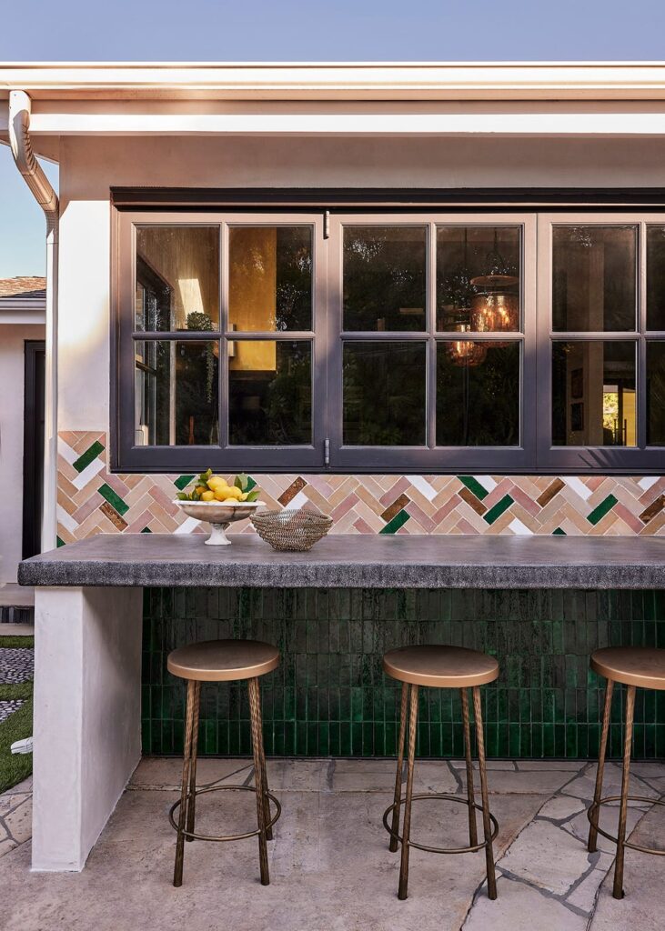 Η Persad ήθελε επίσης να βεβαιωθεί ότι ενσωμάτωσε ενδιαφέροντα πλακάκια σε αυτόν τον χώρο ως έναν τρόπο να προσθέσει περισσότερο χρώμα και ενδιαφέρουσες υφές. Ενώ βασίζεται σε πλακάκια στα περισσότερα έργα, σημειώνει ότι πίεσε τον εαυτό της εδώ, προσπαθώντας να τοποθετήσει μοναδικά πλακάκια σε απροσδόκητες επιφάνειες, όπως τα τζάκια στο σπίτι, στην πισίνα και γύρω από το εξωτερικό μπάρμπεκιου.
