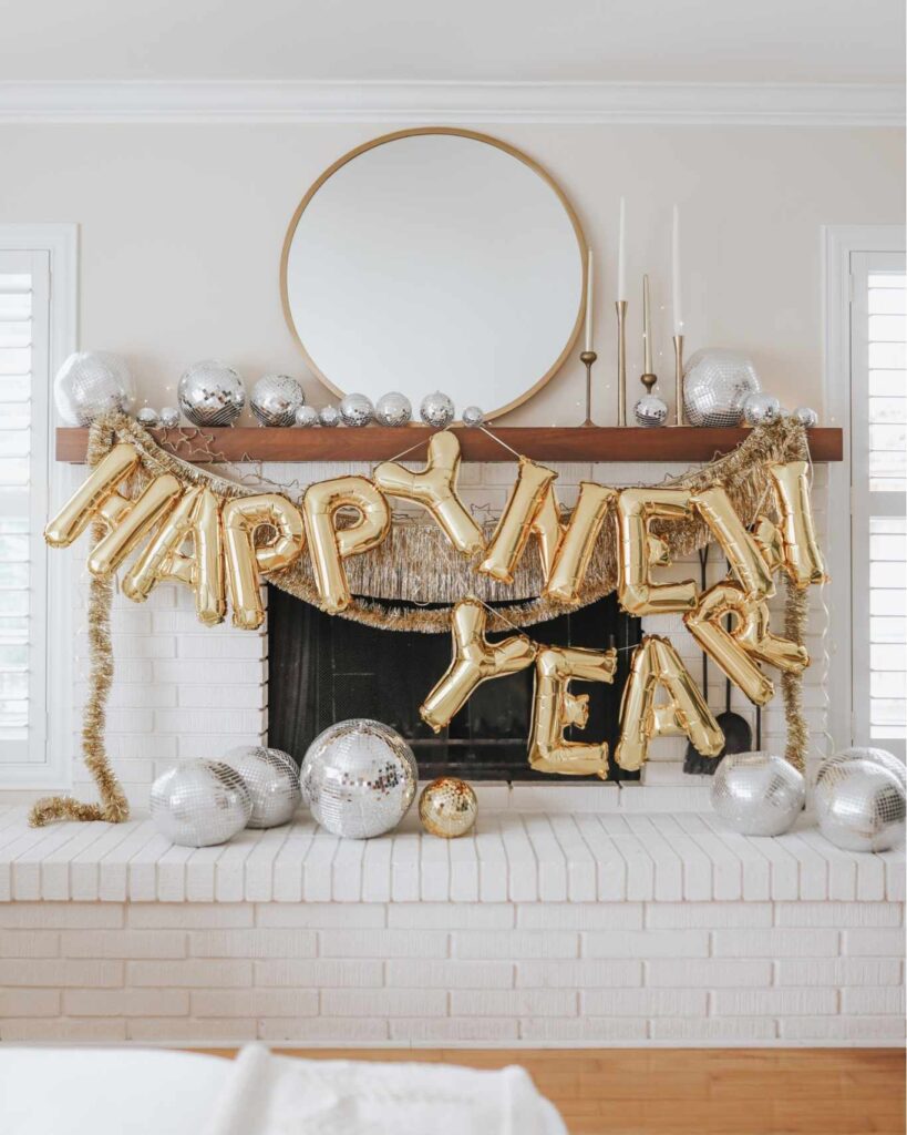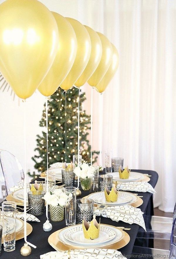 Τίποτα δεν λέει «γιορτή» όπως τα μπαλόνια, ειδικά όταν συνδυάζονται με φωτάκια για μια παιχνιδιάρικη πινελιά. Σκεφτείτε χρυσά μπαλόνια κρέμονται από την οροφή, λαμπυρίζοντας με φόντο τα φωτάκια που δημιουργούν μια ζεστή και μαγική ατμόσφαιρα. Αν έχετε λίγο χρόνο, αυτή η διάταξη είναι ιδανική. Απλώς τοποθετήστε τα σε έναν άδειο τοίχο ή χρησιμοποιήστε τον ως φόντο φωτογραφιών για να ενθαρρύνετε τους καλεσμένους σας να βγάλουν φωτογραφίες, μετατρέποντας τον χώρο σας σε ένα μέρος κατάλληλο για Instagram. Μπορείτε, επίσης, να χρησιμοποιήσετε μπαλόνια στο τραπέζι, με βαράκια, για έξτρα γιορτινή διάθεση.