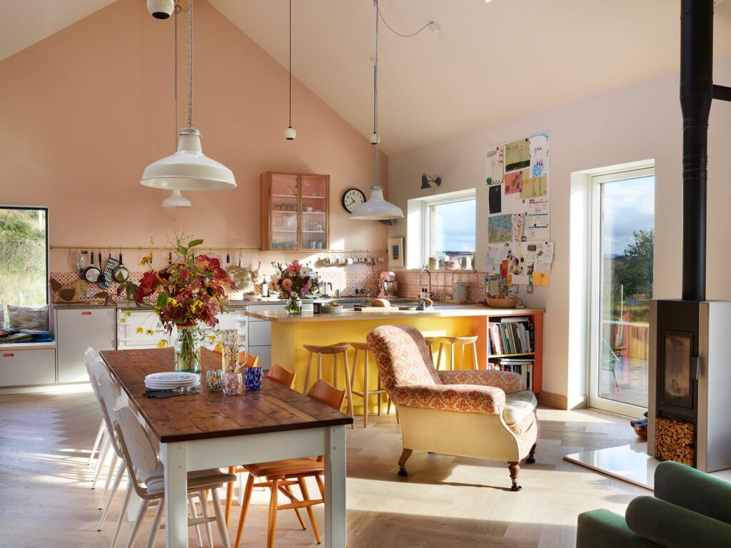 Τα μεγάλα, ανοιχτά δωμάτια μπορεί να είναι πολύ δύσκολα στη διαρρύθμιση, επειδή μπορεί να καταλήξουν να φαίνονται άχαρα και απρόσωπα. Συνήθως είναι πιο αποτελεσματικό να γεμίσετε κάθε εκατοστό που έχετε στη διάθεσή σας δημιουργώντας πολλές μικρές γωνίες – όπως αυτή η κουζίνα με πάγκο πρωινού, άνετη γωνιά καθιστικού, τραπεζαρία και κάθισμα στο παράθυρο – αντί να αφήσετε μια μεγάλη έκταση ανοιχτού χώρου.
