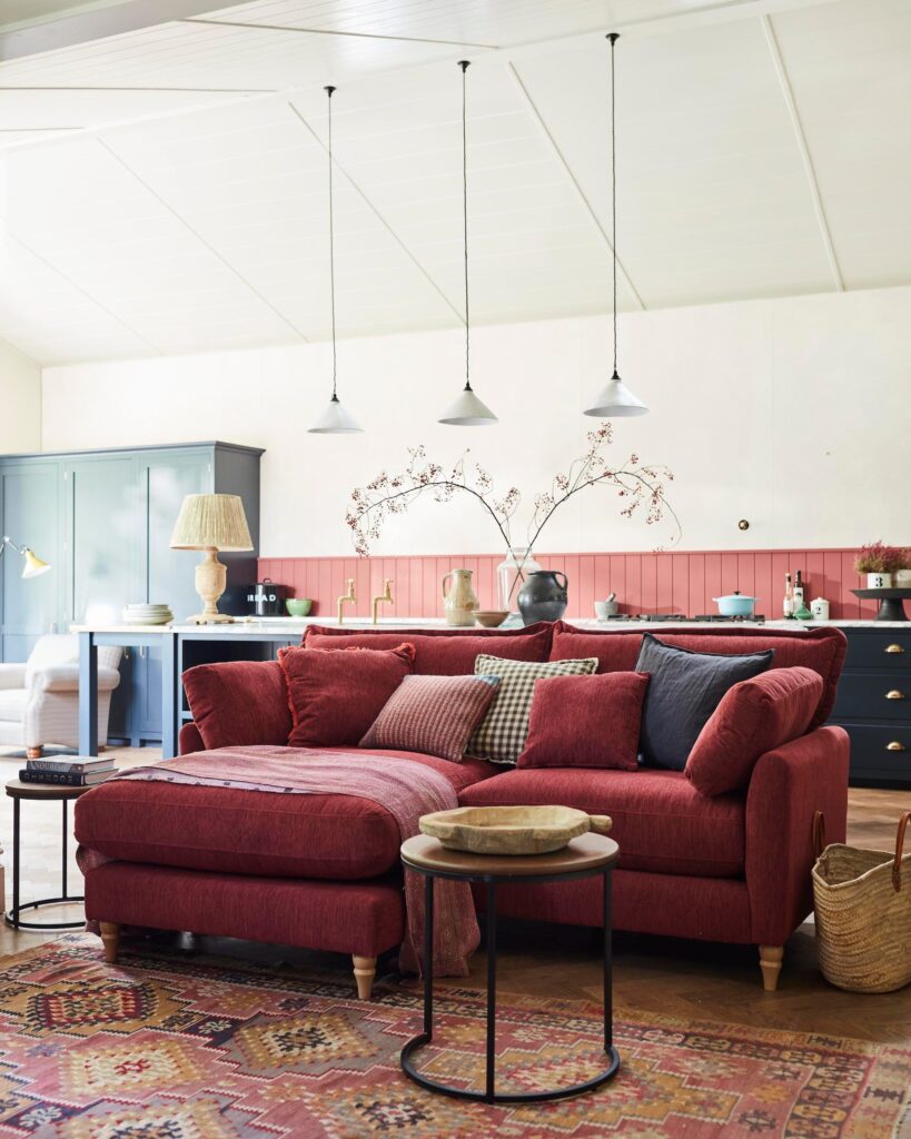 Μην περιπλέκετε υπερβολικά τη διαίρεση ενός ανοιχτού χώρου. Δεν χρειάζεστε τίποτα περισσότερο από έναν καναπέ για να διαχωρίσετε με επιτυχία μια κουζίνα από ένα καθιστικό, και ένα χαλί μόνο ενισχύει το αποτέλεσμα. Μπορείτε επίσης να επιλέξετε διαφορετικούς χρωματικούς συνδυασμούς μεταξύ των δύο χώρων, αλλά ένας έξυπνος συνδυασμός μπορεί να φαίνεται κομψός – επιτυγχάνεται εδώ με τους ροζ τόνους του καναπέ, του χαλιού και της πλακόστρωσης.