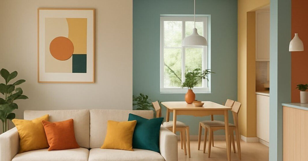 Στον συγκεκριμένο χώρο, ο συνδυασμός αυτών των χρωμάτων λειτουργεί εξαιρετικά γιατί ισορροπεί τη ζεστασιά με τη φρεσκάδα. Οι ουδέτερες βάσεις (μπεζ, εκρού και ανοιχτό ξύλο) κρατούν τον χώρο φωτεινό και ήρεμο, επιτρέποντας στα πιο έντονα χρώματα να ξεχωρίσουν χωρίς να «βαραίνουν» το σύνολο. Αυτό είναι ιδανικό για open-plan χώρους, όπου το μάτι χρειάζεται ξεκούραση και συνοχή.