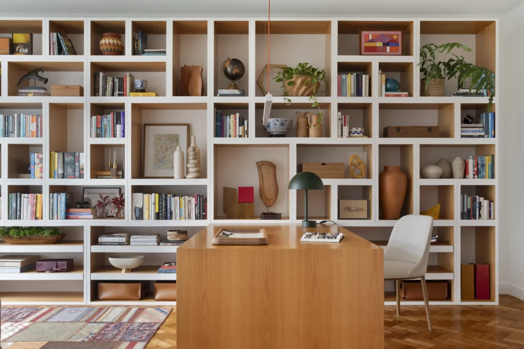 Η φωτογραφία απεικονίζει έναν κομψό, καλοσχεδιασμένο εσωτερικό χώρο με κυρίαρχο στοιχείο μια μεγάλη, εντοιχισμένη βιβλιοθήκη που καλύπτει σχεδόν ολόκληρο τον τοίχο. Η βιβλιοθήκη αποτελείται από γεωμετρικά, τετράγωνα και ορθογώνια ράφια σε ανοιχτόχρωμο ξύλο και λευκό πλαίσιο, δημιουργώντας έναν ρυθμικό, συμμετρικό κάνναβο που δίνει αίσθηση τάξης και ισορροπίας στον χώρο. Στα ράφια της βιβλιοθήκης συνυπάρχουν βιβλία και διακοσμητικά αντικείμενα σε προσεκτικά μελετημένη διάταξη. Τα βιβλία είναι τοποθετημένα τόσο κάθετα όσο και οριζόντια, σπάζοντας τη μονοτονία και προσθέτοντας οπτικό ενδιαφέρον. Ανάμεσά τους ξεχωρίζουν κεραμικά αγγεία, γλυπτικά αντικείμενα, ένα μικρό υδρόγειο και κουτιά αποθήκευσης, που δίνουν βάθος και προσωπικότητα στη σύνθεση χωρίς να την υπερφορτώνουν.