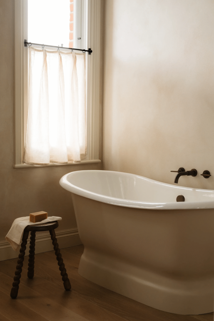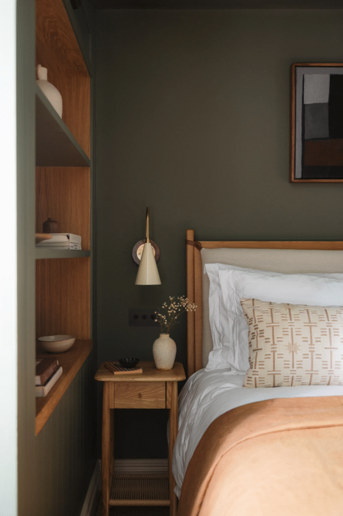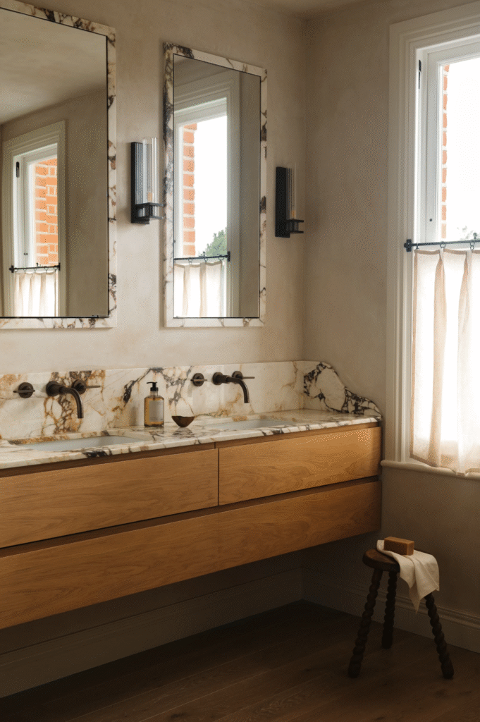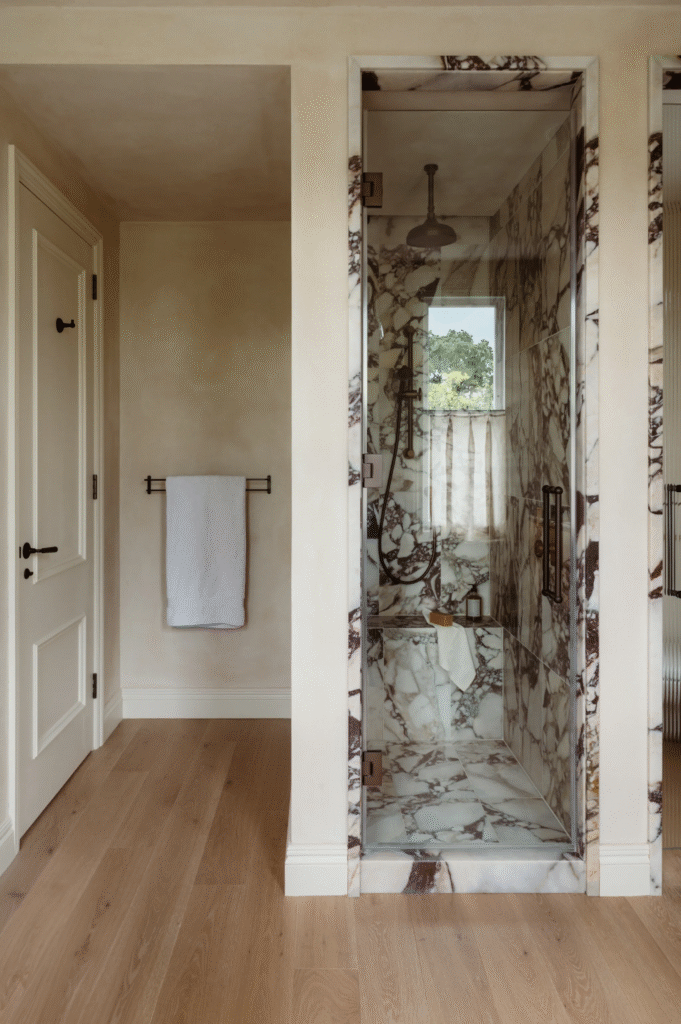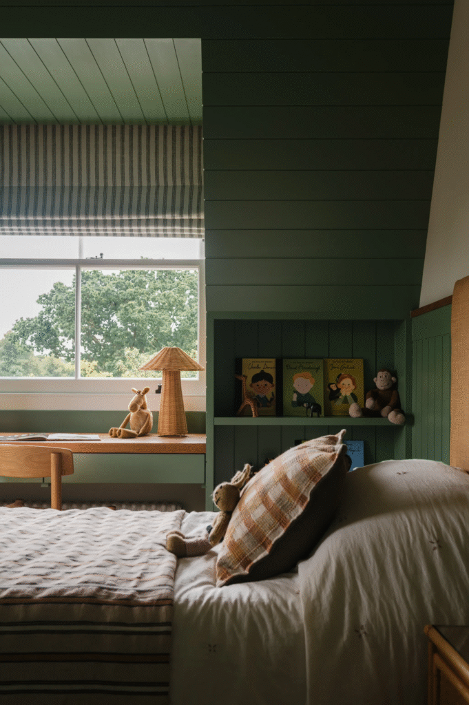 Τα παιδικά υπνοδωμάτια, στον δεύτερο όροφο, σχεδιάστηκαν με γνώμονα τη μακροζωία. Η γλώσσα και η αυλάκωση μαλακώνουν τις κεκλιμένες οροφές, ενώ τα κατά παραγγελία ξύλινα στοιχεία δημιουργούν χώρους αποθήκευσης και γραφείου. Ομοίως, το μπάνιο τους – το οποίο έχει πλακάκια ντους zellige σε ρίγες – είναι μια προσεκτικά κατασκευασμένη ισορροπία διασκέδασης, λειτουργικότητας και διαχρονικότητας.