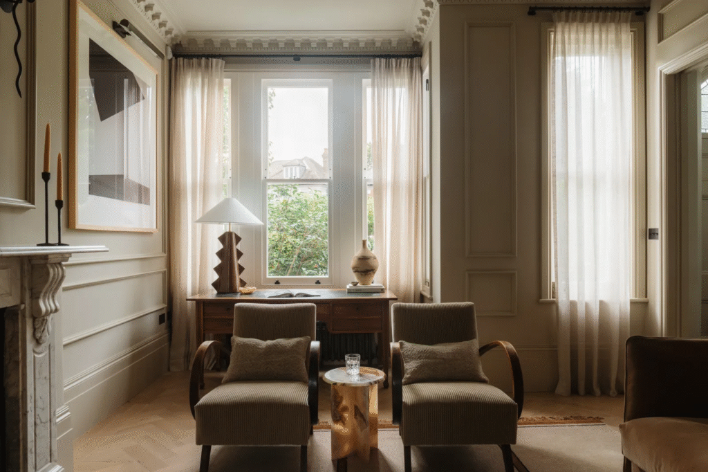 Η πελάτισσα, η οποία έχει υπόβαθρο στην αρχιτεκτονική και μάτι για το μοντέρνο σχεδιασμό, είχε αρχικά σχεδιάσει να αναλάβει η ίδια την επίπλωση, αλλά η κλίμακα του έργου την ανάγκασε να το ξανασκεφτεί. Η Emma, ιδρύτρια του στούντιο Design & That με έδρα το ανατολικό Λονδίνο, έχει ήδη αποκτήσει φήμη για σύγχρονους αλλά και βιώσιμους εσωτερικούς χώρους. Δεν υπάρχουν επιτηδευμένες λεπτομέρειες ή περίτεχνες λεπτομέρειες στο έργο της, σκεφτείτε αντ’ αυτού γλυπτά σχήματα, καθαρές γραμμές και απαλούς τόνους.