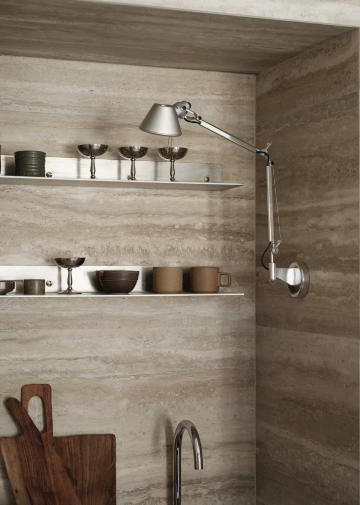 Πρώτον, η Camille επέλεξε ταβερτίνη «για την αντοχή της, ειδικά όταν συνδυάζεται με ξύλο και το πολύ ουδέτερο λευκό του υπόλοιπου διαμερίσματος» λέει. «Είναι κομψή, διακριτική και δυναμική. Αυτό που μου αρέσει περισσότερο είναι το πώς το μεταβαλλόμενο φως κατά τη διάρκεια της ημέρας ζωντανεύει τον τραβερτίνη και δίνει ζωή σε ολόκληρο το διαμέρισμα».
