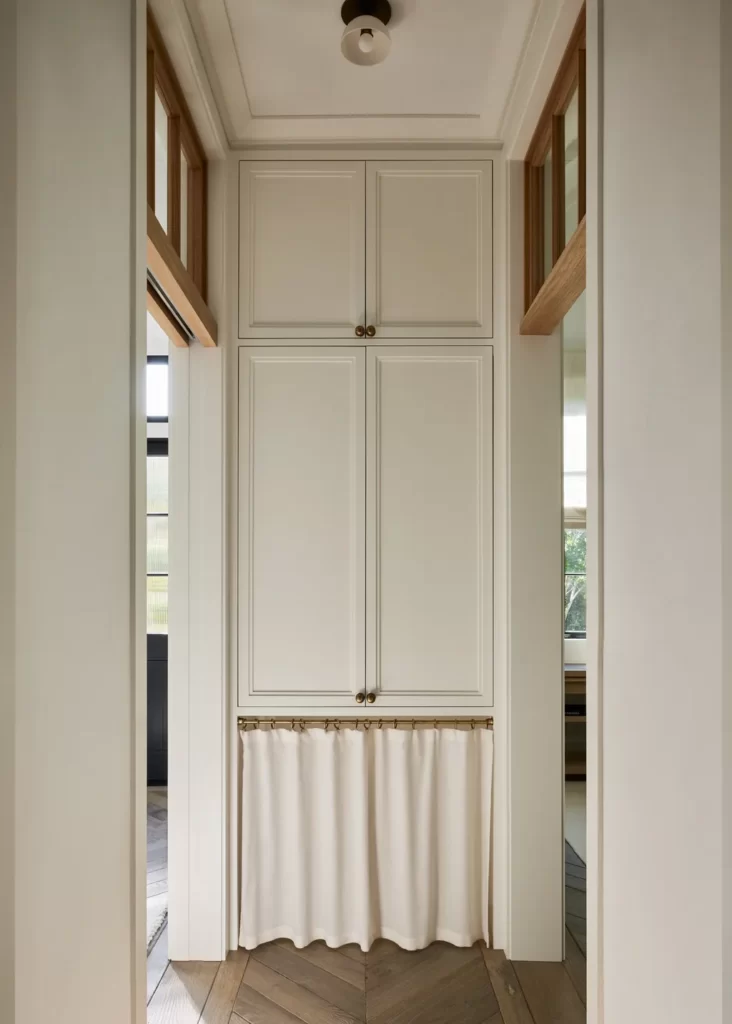 Για μια διαφορετική εκδοχή της αποθήκευσης με ”φούστα”, οι αρχιτέκτονες αυτού του σπιτιού στο East Hampton σχεδίασαν ξυλουργικές κατασκευές για το μοντέρνο διάδρομο μεταξύ του κύριου υπνοδωματίου και του μπάνιου. «Σχεδιάστηκε για να φιλοξενήσει τα λευκά είδη του πελάτη» εξηγεί η Maureen McDermott, ιδρύτρια του Winter McDermott, του στούντιο που σχεδίασε το σπίτι. «Η κουρτίνα κρύβει τα καλάθια των πλυντηρίων» εξηγεί.