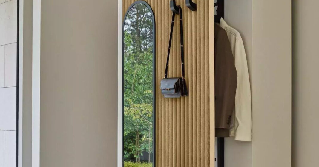 Η πιο κάτω φωτογραφία απεικονίζει έναν μίνιμαλ χώρο εισόδου με καθαρές γραμμές, ήρεμη χρωματική παλέτα και έντονη έμφαση στα φυσικά υλικά. Κεντρικό ρόλο παίζει ο συρόμενος ραβδωτός τοίχος από ξύλο, ο οποίος λειτουργεί ταυτόχρονα ως διαχωριστικό και ως λειτουργικό έπιπλο. Οι κάθετες ραβδώσεις του δημιουργούν μια έντονη αίσθηση ρυθμού και βάθους, προσθέτοντας υφή και ζεστασιά στον κατά τα άλλα λιτό χώρο.