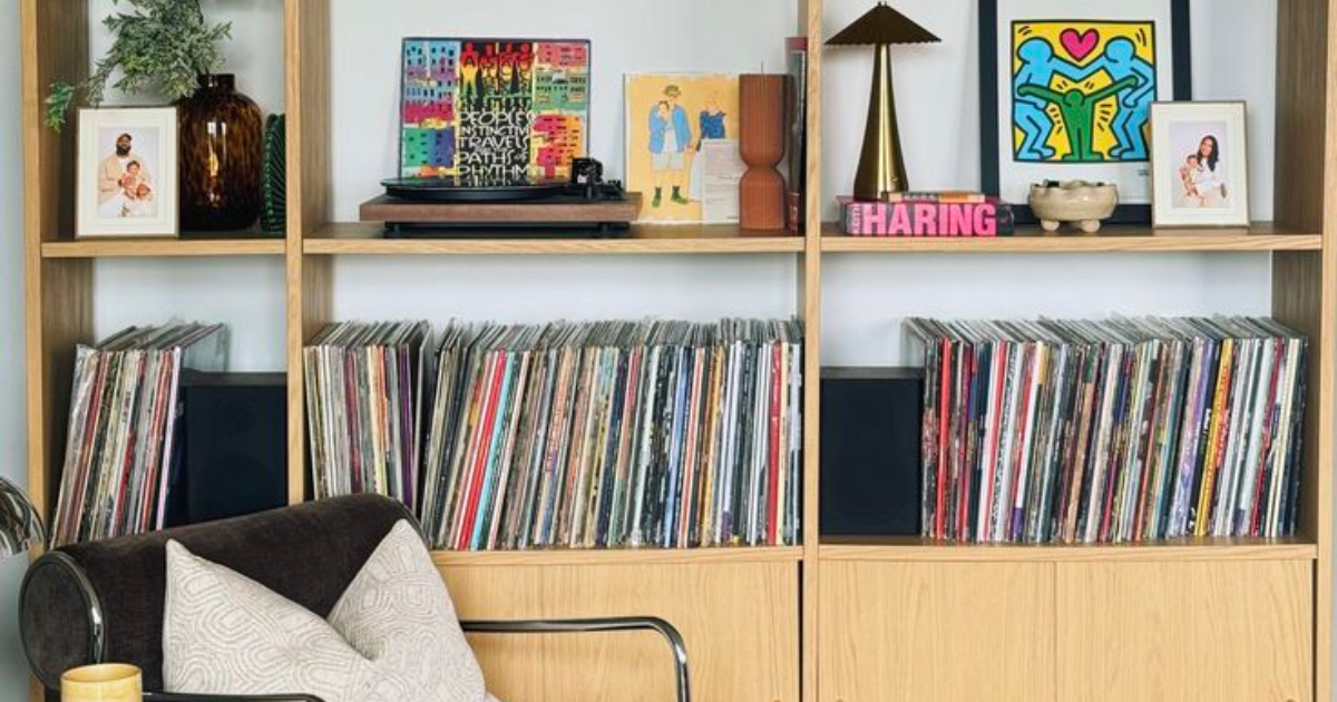 Ακόμα και το κάτω μέρος, όπου βρίσκονται τα βινύλια, δεν βαραίνει το σύνολο. Η ομοιόμορφη γραμμή που σχηματίζουν οι δίσκοι λειτουργεί σχεδόν σαν βάση, δίνοντας σταθερότητα χωρίς να κλέβει φως ή προσοχή. Τα κλειστά ντουλάπια από κάτω κρύβουν την ακαταστασία και κρατούν τον χώρο καθαρό οπτικά. Έτσι, η βιβλιοθήκη δείχνει πλούσια και γεμάτη χαρακτήρα, αλλά παραμένει κομψή, ανάλαφρη και απόλυτα ισορροπημένη.