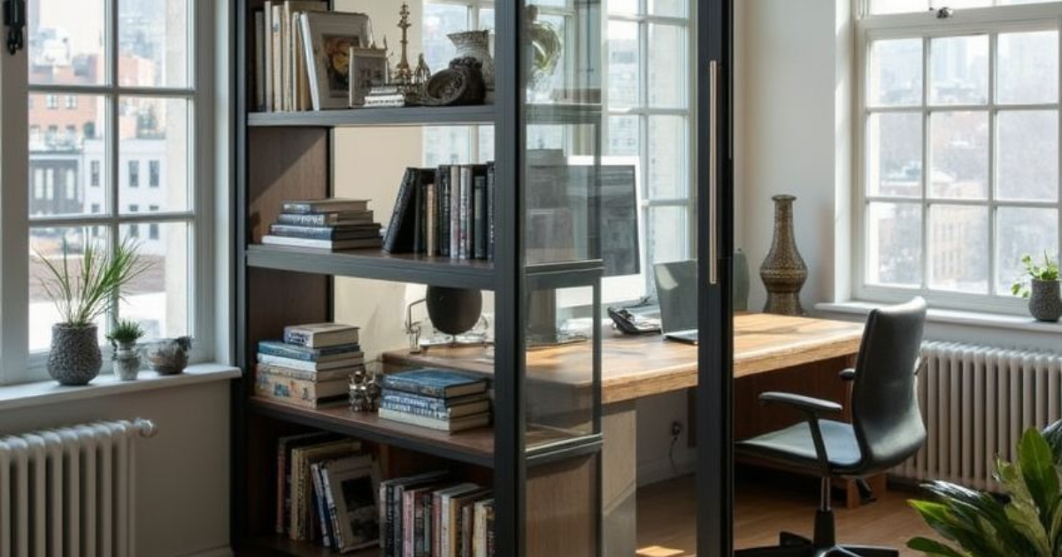 Η βιβλιοθήκη δεν είναι απλώς αποθηκευτικός χώρος, αλλά αρχιτεκτονικό στοιχείο. Η γυάλινη πόρτα που ενσωματώνεται σε αυτήν επιτρέπει στο φως να περνά, χωρίς να βαραίνει τον χώρο, ενώ παράλληλα προσφέρει ηχομόνωση και ιδιωτικότητα στο γραφείο. Έτσι, ο “τοίχος” της βιβλιοθήκης χωρίζει τις λειτουργίες του χώρου χωρίς να τις απομονώνει οπτικά. Πίσω από τη βιβλιοθήκη αποκαλύπτεται το γραφείο: ένα λιτό, ξύλινο γραφείο εργασίας με σύγχρονη καρέκλα, τοποθετημένο μπροστά στο παράθυρο.