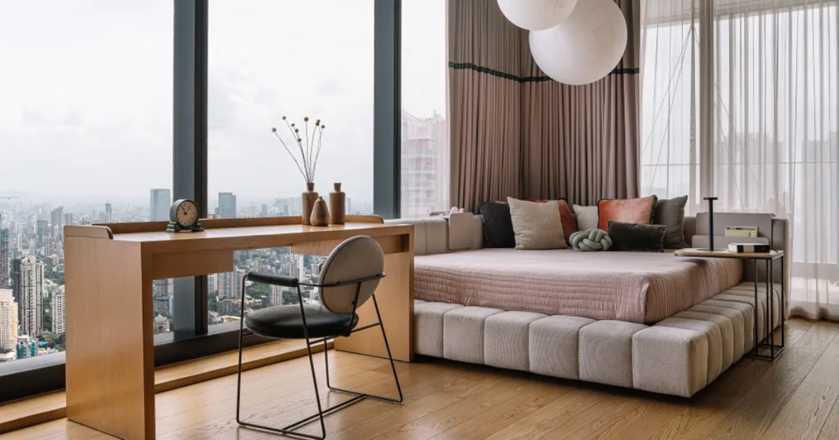 Πέρα από τη λειτουργικότητα, αυτή η τοποθέτηση ενισχύει επίσης μια ήσυχη αισθητική πολυτέλειας που βασίζεται στον έξυπνο χωροταξικό σχεδιασμό, ενώ παράλληλα προσδίδει στη ζώνη ύπνου μια αίσθηση άνεσης. «Ο σχεδιασμός ξεδιπλώνεται μέσα από μια ρευστή, γραμμική σύνθεση, όπου ένα ηλιόλουστο γραφείο μελέτης και μια ενσωματωμένη συρταριέρα μεταβαίνουν άψογα στην ντουλάπα, οδηγώντας τελικά σε ένα γωνιακό κρεβάτι» προσθέτει η Priti K Dhumal, της κρεβατοκάμαρας που απεικονίζεται πιο κάτω.