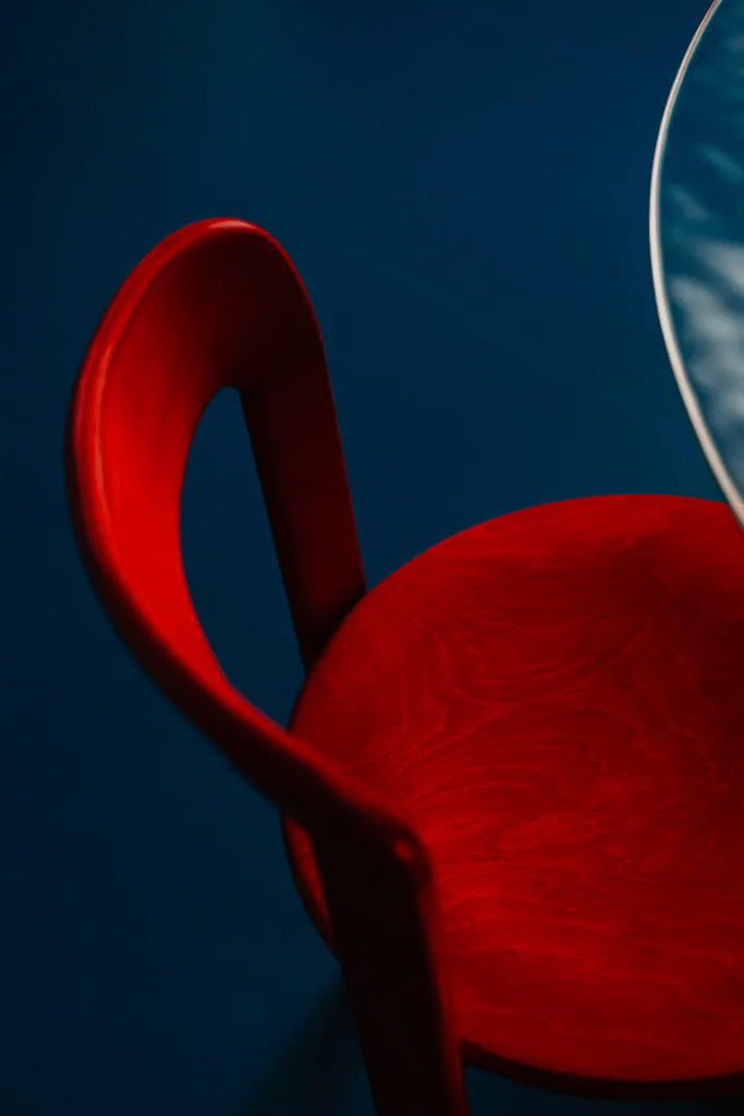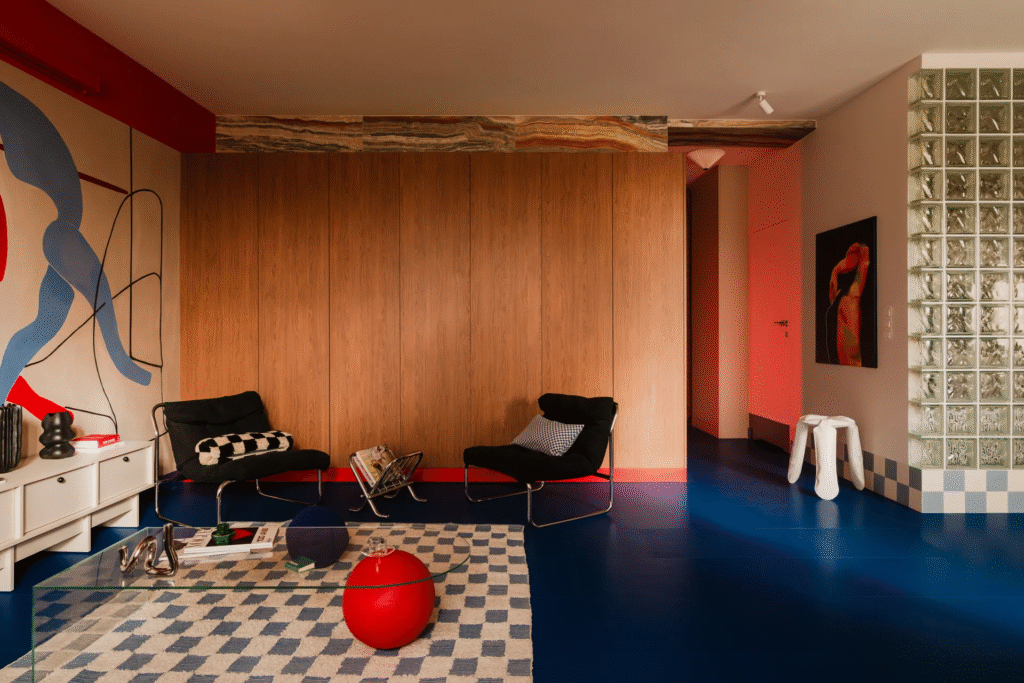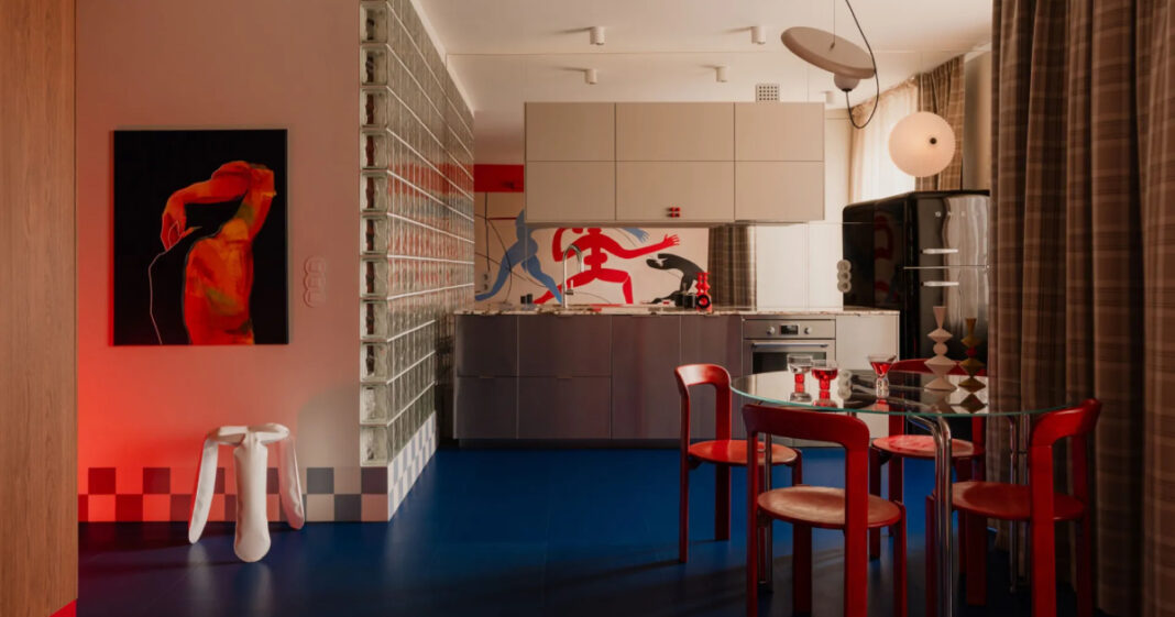 Ούτε το χρώμα είναι επίπεδο. Εν μέρει εμπνευσμένη από το έργο τέχνης του Keith Haring, η ιδιοκτήτρια ονειρεύτηκε μια τοιχογραφία με χορευτές στον τοίχο του σαλονιού. Ζωγραφισμένη από τον Michał Nalewajko, οι φιγούρες αποδίδονται σε αντίθετες αποχρώσεις του κόκκινου και του μπλε, προσθέτοντας αυτό που η Gosia αποκαλεί «παλμικό» εφέ στην παλέτα. Οι φωτεινές, κορεσμένες αποχρώσεις είναι αμερόληπτες, αλλά στοχευμένες.