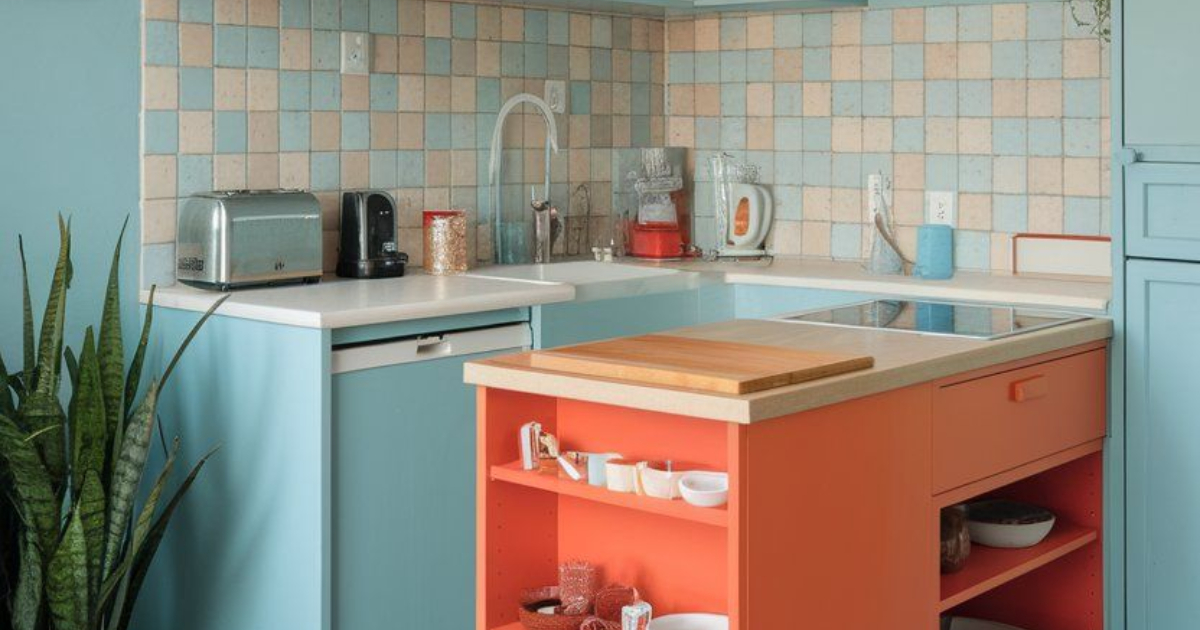 Το νησί σε έντονο κοραλλί / πορτοκαλί λειτουργεί ως χρωματική έκπληξη μέσα στον μικρό χώρο. Παρότι είναι έντονο, δεν μικραίνει οπτικά την κουζίνα, γιατί χρησιμοποιείται σε ένα μόνο στοιχείο και συνδυάζεται με ανοιχτόχρωτο πάγκο. Αντίθετα, δίνει χαρακτήρα και εστιακό σημείο. Τέλος, το δάπεδο με τα γεωμετρικά μοτίβα σε ουδέτερους τόνους «δένει» όλα τα χρώματα μεταξύ τους και προσθέτει βάθος.