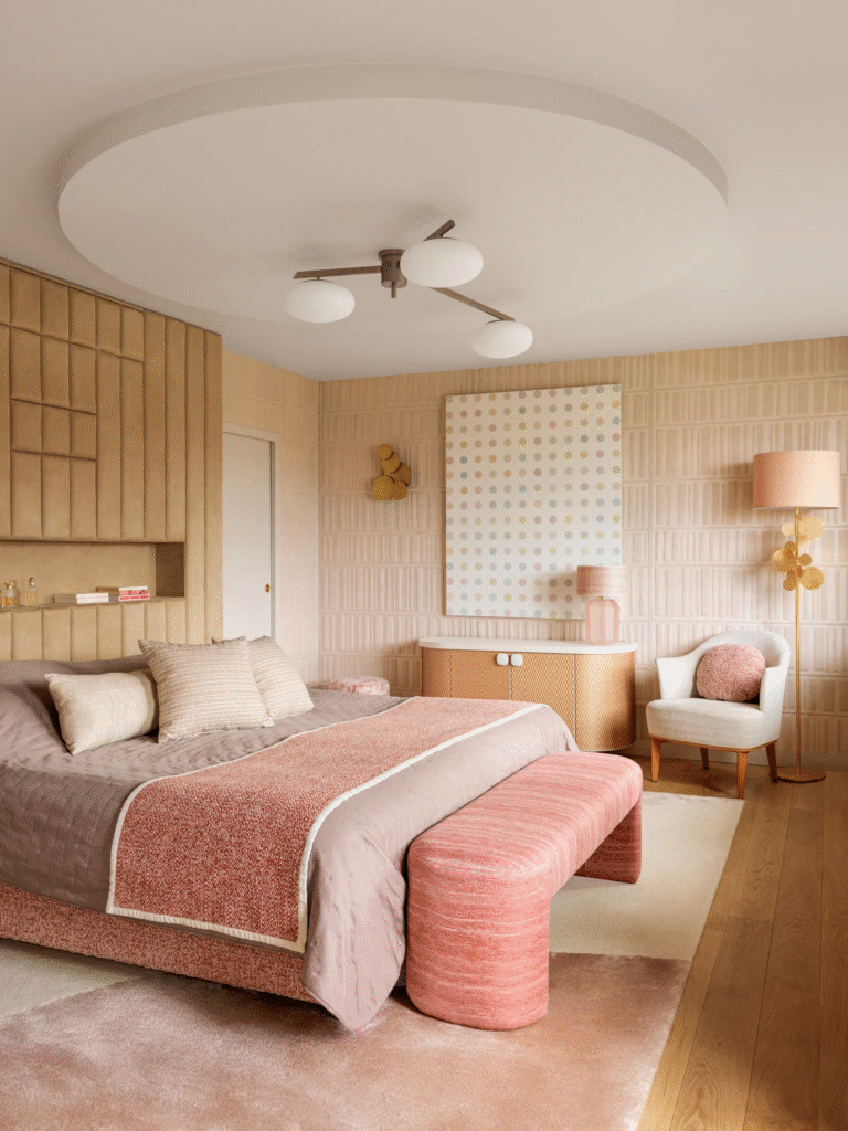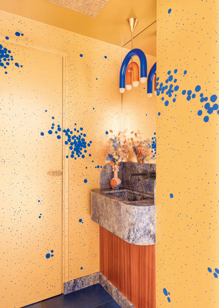 Μεγάλο μέρος της διακόσμησης ήταν εμπνευσμένο από τη συλλογή έργων τέχνης της πελάτισσας της. Ο πίνακας με τις κουκκίδες του Damien Hirst ήταν το σημείο εκκίνησης για τις παστέλ αποχρώσεις στο κύριο μοντέρνο υπνοδωμάτιο, ενώ οι μεταλλικοί τόνοι στην κουζίνα προέρχονταν από το γλυπτό τοίχου της γεωργιανής καλλιτέχνιδας Thea Djordjadze στην παρακείμενη τραπεζαρία. «Σε πολλά από τα δωμάτιά μου, δουλεύω με το ίδιο χρώμα και το χρησιμοποιώ σε μια ποικιλία διαφορετικών αποχρώσεων» εξηγεί η Anne-Sophie.