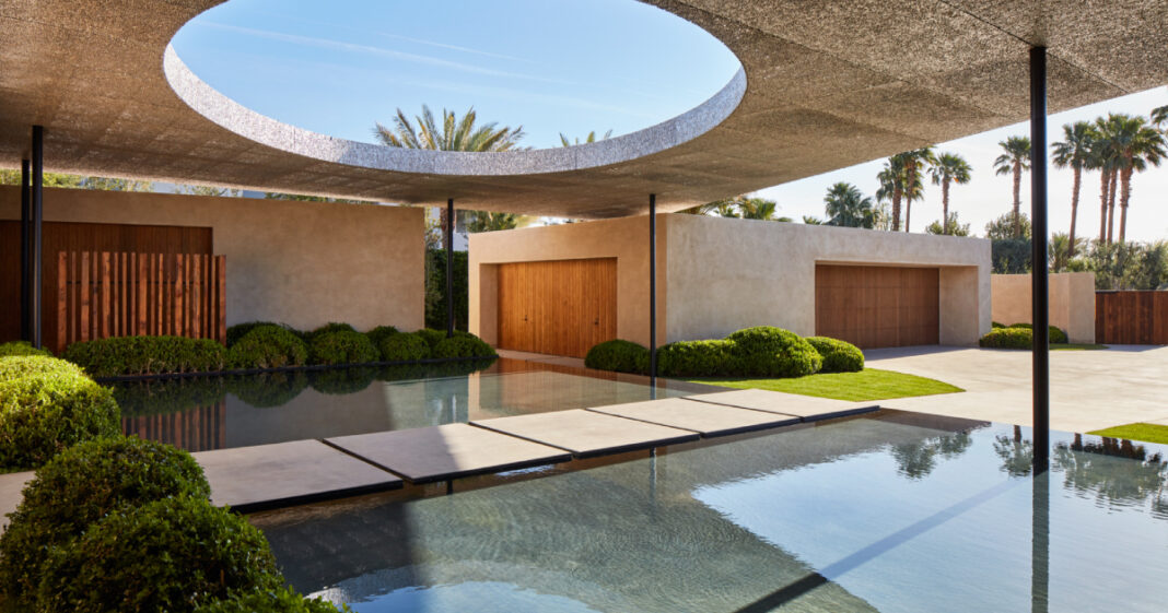 Από τα πρώτα βήματα στο εσωτερικό, το Madison Desert Club έχει σχεδιαστεί σκόπιμα για να προσφέρει την αίσθηση του να είσαι έξω όταν μετακινείσαι από δωμάτιο σε δωμάτιο. Επιπλέον, χρησιμοποιούνται μοναδικά στοιχεία σχεδιασμού για να ενισχύσουν τη σύνδεση του σπιτιού με τον εξωτερικό χώρο, ξεκινώντας με μια συνεχή στέγη σε στυλ θόλου που τοποθετείται πάνω από τμήματα του σύγχρονου σπιτιού, προσφέροντας μια εναλλαγή φωτός καθ’ όλη τη διάρκεια της ημέρας. Ένα άλλο στοιχείο που παρατηρείται κατά την άφιξη είναι το Oculus – ένα κυκλικό σχήμα ενσωματωμένο στην οροφή, το οποίο επιτρέπει την απρόσκοπτη θέα στον ουρανό από πάνω.