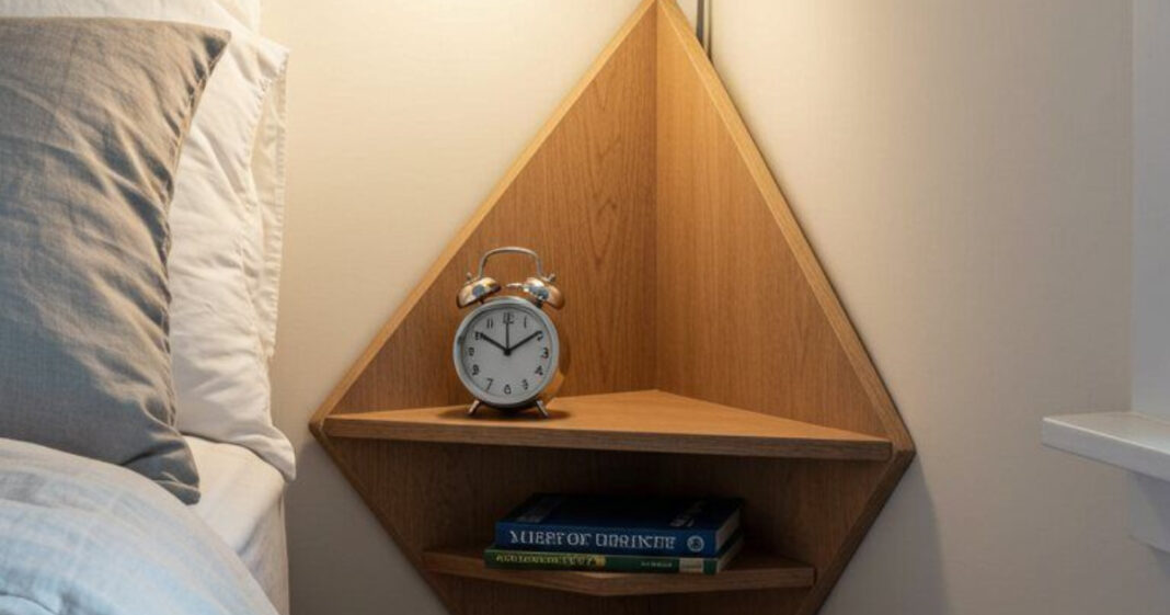 Το κομοδίνο της φωτογραφίας είναι μια ιδιαίτερα έξυπνη και κομψή λύση για μικρούς χώρους, γιατί αξιοποιεί μια συνήθως «νεκρή» γωνία του δωματίου. Είναι τοποθετημένο ακριβώς στη γωνία, με τριγωνικό σχεδιασμό από ξύλο, κάτι που του επιτρέπει να προσφέρει λειτουργικότητα χωρίς να καταλαμβάνει πολύτιμο χώρο στο δάπεδο. Έτσι, ο χώρος παραμένει ανοιχτός και οπτικά ελαφρύς – ιδανικό για υπνοδωμάτια με περιορισμένα τετραγωνικά. Παρά το μικρό του μέγεθος, το κομοδίνο είναι πρακτικό. Η επάνω επιφάνεια χωρά τα απαραίτητα για το κρεβάτι, όπως ένα ξυπνητήρι ή το κινητό, ενώ το χαμηλότερο ράφι προσφέρει αποθηκευτικό χώρο για βιβλία ή μικρά αντικείμενα. Ο συνδυασμός του με το φωτιστικό ενισχύει ακόμα περισσότερο τη λειτουργικότητα, αφού δεν χρειάζεται επιτραπέζια λάμπα και εξοικονομείται επιπλέον χώρος.
