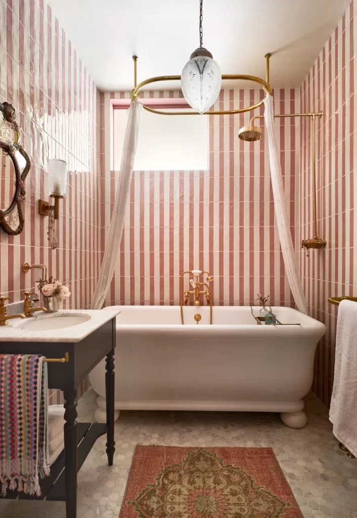 Τα ριγέ πλακάκια σε ροζ και λευκό δημιουργούν ένα ζωηρό φόντο σε μια μπανιέρα με σφαιρικά πόδια και παραδοσιακά ορειχάλκινα σκεύη. Η ενσωμάτωση του ροζ σε ένα σύγχρονο μοτίβο όπως αυτό είναι ένας πολύ καλός τρόπος για να δοκιμάσετε την τάση χωρίς να την επιβαρύνετε με οτιδήποτε άλλο.