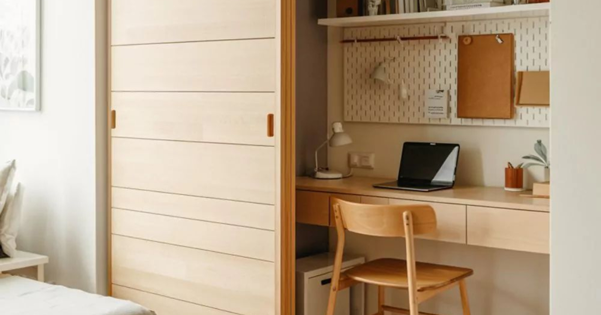 Οι μικροί χώροι απαιτούν έξυπνες και πολυλειτουργικές λύσεις, ακόμα κι αν στη σκέψη ακούγονται παράξενες, ακόμα και.. αστείες! Μία από τις πιο πρωτότυπες ιδέες είναι το γραφείο που κρύβεται μέσα σε μια ντουλάπα – ένας διακριτικός, οργανωμένος χώρος εργασίας που εμφανίζεται μόνο όταν τον χρειάζεσαι. Η συρόμενη ξύλινη πόρτα, σε ανοιχτό φυσικό χρώμα, αποκαλύπτει έναν πλήρως οργανωμένο σταθμό γραφείου, μετατρέποντας έναν αποθηκευτικό χώρο σε ένα διακριτικό, μίνι γραφείο μέσα στο υπνοδωμάτιο.