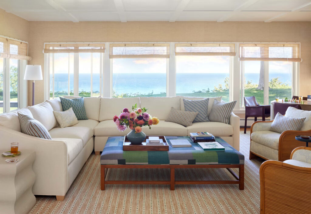 Για ένα ζευγάρι που πέρασε τα καλοκαίρια της παιδικής του ηλικίας στις όχθες της λίμνης Μίσιγκαν, η αγορά ενός εξοχικού στην περιοχή έμοιαζε λιγότερο με απόφαση αγοράς ακινήτων και περισσότερο με μια αναπόφευκτη επιστροφή στο σπίτι. Χτισμένο το 1990, το σπίτι είχε έλλειψη αρχιτεκτονικής γοητείας αλλά έντονη παρουσία από ιδιόρρυθμες γωνίες. Στόχος της σχεδιάστριας Colleen Simonds ήταν να τις εξαφανίσει οπτικά, αντικαθιστώντας τις αδέξιες γραμμές με μια αίσθηση ζεστασιάς και συνοχής. Βοήθησε το γεγονός ότι, ενώ το ίδιο το σπίτι μπορεί να ήταν αδιάφορο, η θέα στη λίμνη ήταν οτιδήποτε άλλο εκτός από αυτό.