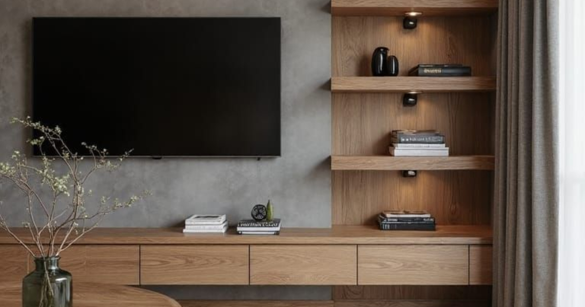 Το σαλόνι της φωτογραφίας αποπνέει μια ήρεμη, μίνιμαλ αισθητική με ζεστούς τόνους ξύλου και ουδέτερες επιφάνειες. Ο τοίχος της τηλεόρασης συνδυάζει ένα απαλό γκρι φινίρισμα με μια ενσωματωμένη σύνθεση που χαμηλώνει οπτικά το χώρο, ενώ το μακρύ χαμηλό έπιπλο λειτουργεί ως διακριτική αποθήκευση χωρίς να βαραίνει το σύνολο. Ιδιαίτερο ενδιαφέρον παρουσιάζουν τα κάθετα ράφια δίπλα από την τηλεόραση, τα οποία αξιοποιούν πλήρως το ύψος του τοίχου. Η κατασκευή είναι ενσωματωμένη και «αγκαλιάζει» τη γωνία, δημιουργώντας μια καθαρή, αρχιτεκτονική γραμμή που δεν δείχνει φορτωμένη.