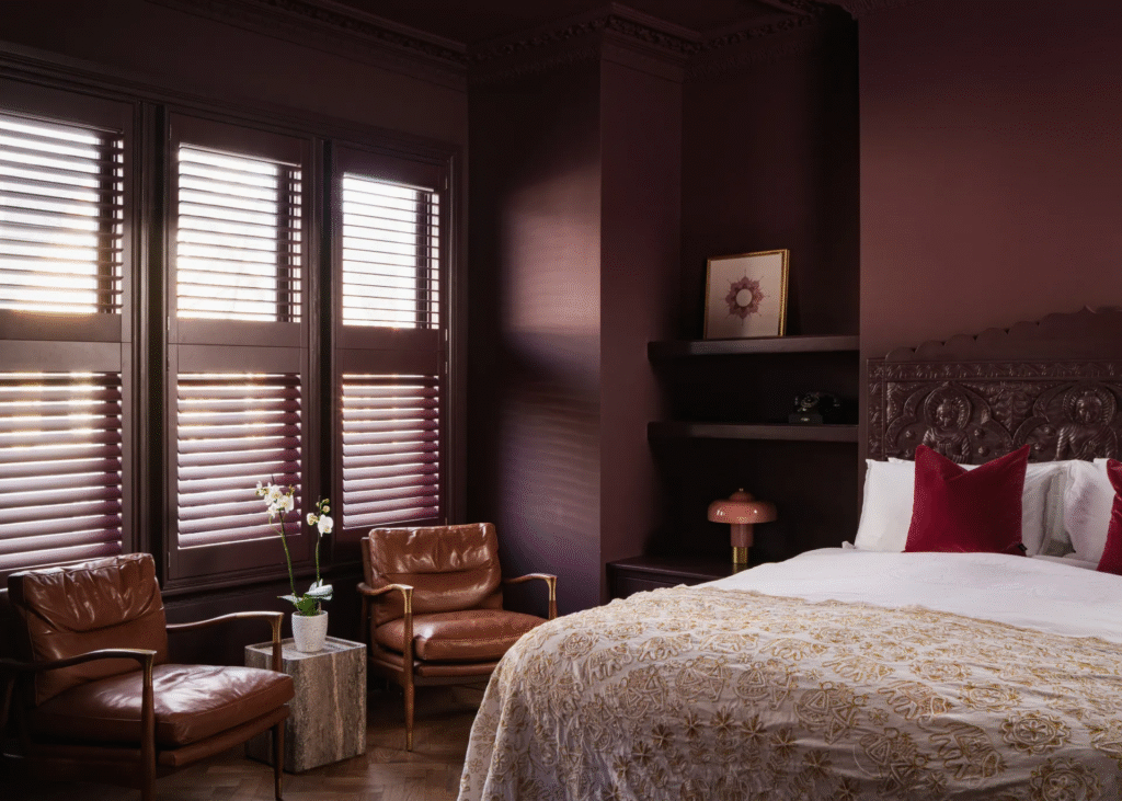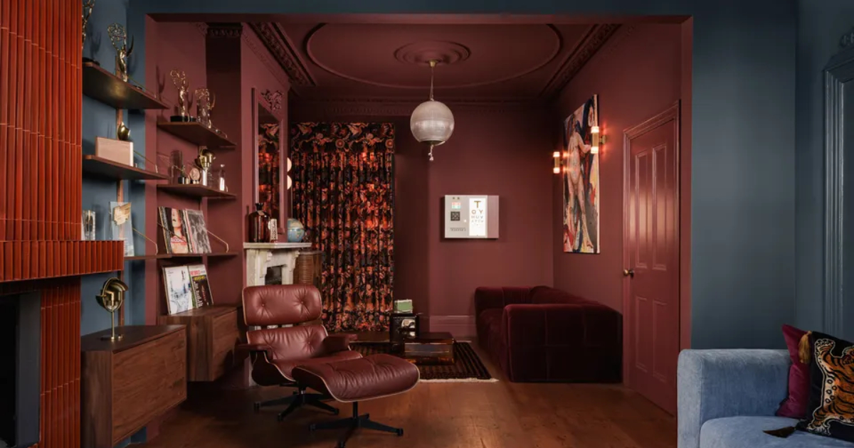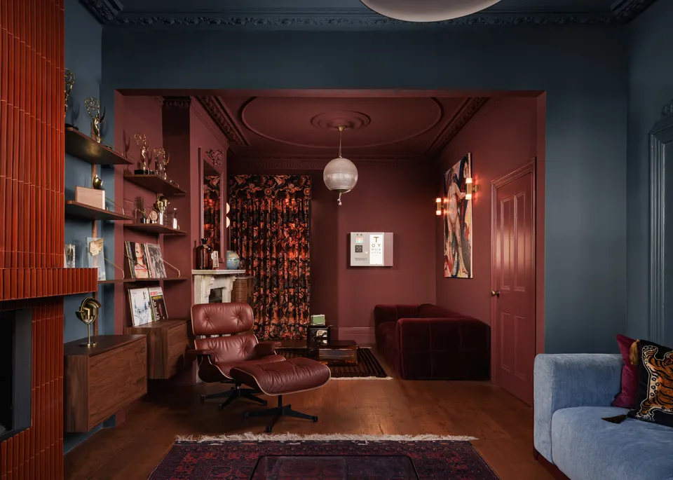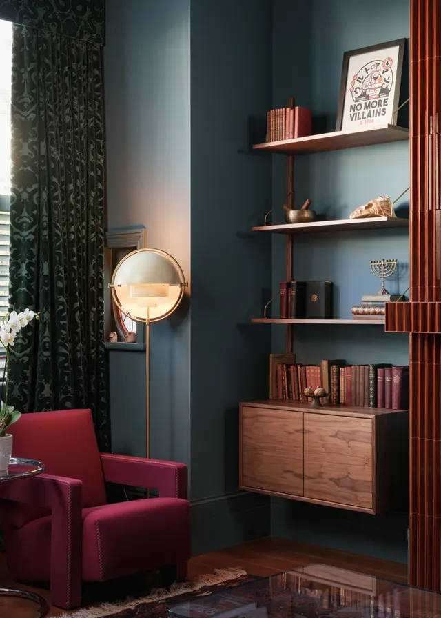 Η moody χρωματική παλέτα είναι ταυτόχρονα εκφραστική και σαγηνευτική – τολμηρή και θεατρική, αλλά και αναζωογονητική και ήρεμη. Με τους πελάτες να έλκονται από τoν κινηματογράφο των μέσων του αιώνα – κυρίως το έργο του Wes Anderson – ο στόχος της Zoe ήταν «να υποκλιθεί στις χρωματικές παλέτες και την αίσθηση συμμετρίας του Anderson χωρίς ποτέ να δίνει την αίσθηση κυριολεκτικής ή θεματικής. «Αντίθετα, χρησιμοποίησα διακριτικά τη συμμετρία, αντικατοπτρίζοντας την τοποθέτηση χρωμάτων και τις πινελιές μεταξύ των μπροστινών και των πίσω καθιστικών για να δημιουργήσω συνοχή και ρυθμό» εξηγεί η Zoe, με κάθε χώρο σχεδιασμένο για τον δικό του συναισθηματικό σκοπό.