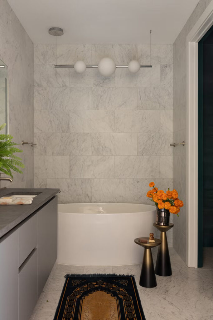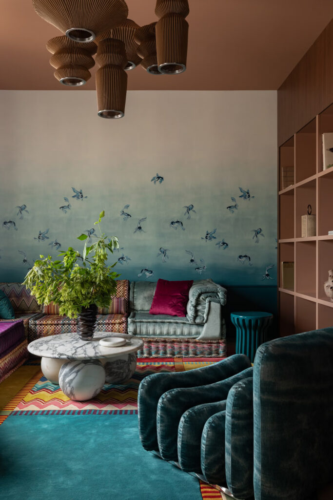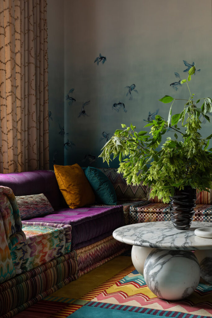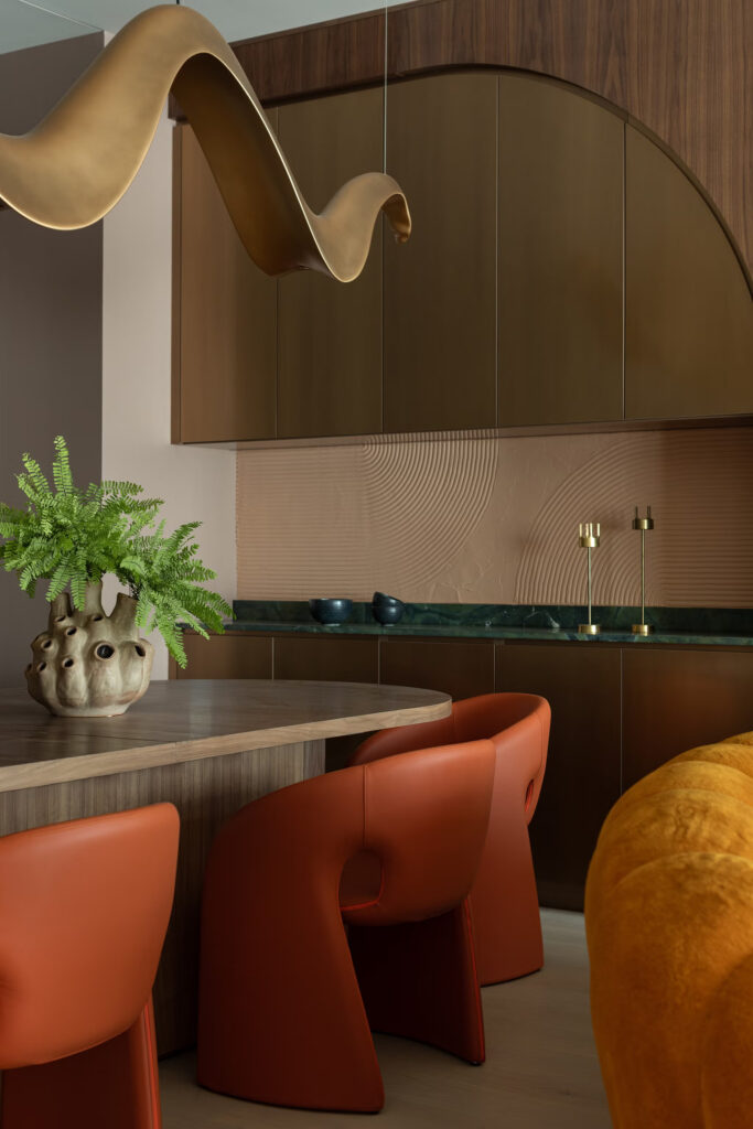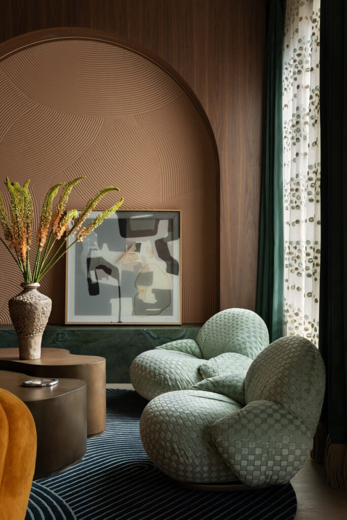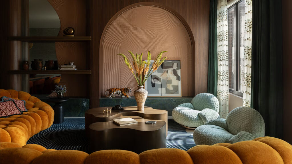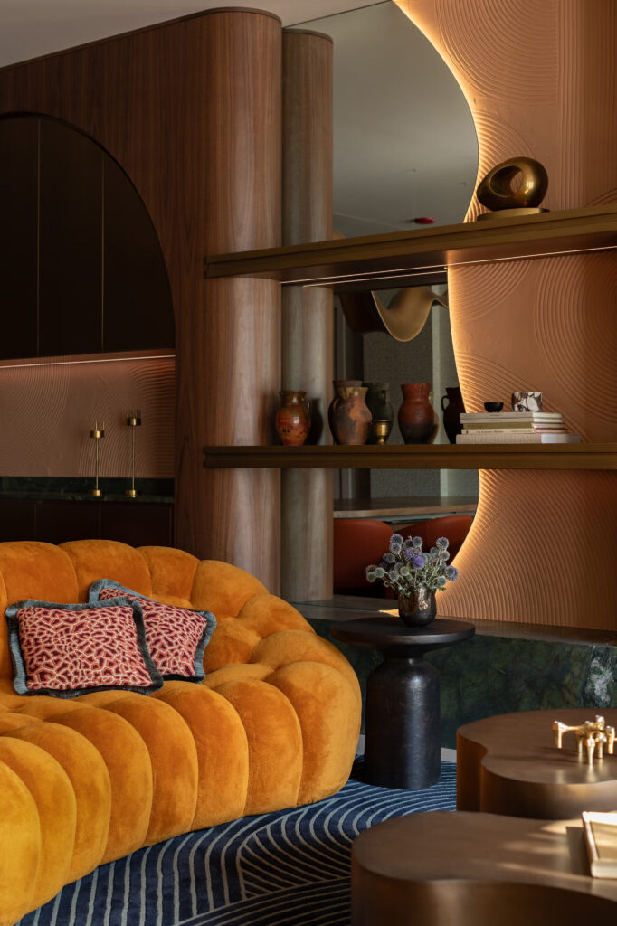 Η ανώτερη σχεδιάστρια του έργου Rachel Benitez θυμάται την πρόκληση να διασφαλιστεί ότι κάθε στοιχείο είχε τη δική του στιγμή χωρίς να κατακλύζει τον χώρο. «Κάθε υλικό χρειαζόταν χρώμα, μοτίβο και υφή» λέει. «Ακούγεται σαν όνειρο, αλλά χρειάστηκαν πολλές επαναλήψεις – και πολλά δείγματα – για να γίνει σωστά». Αυτό ξεδιπλώνεται με όμορφο ρυθμό, όπου τα γλυπτά έπιπλα, οι τρισδιάστατες ταπετσαρίες και τα πλούσια σε στρώσεις φινιρίσματα δημιουργούν έναν ρυθμό που μοιάζει σκόπιμος παρά χαοτικός.