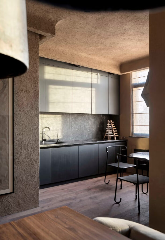 Ο Ουκρανός αρχιτέκτονας και σχεδιαστής Sergey Makhno καθοδηγείται από τις αρχές του wabi-sabi σε όλη την καριέρα του. Στο δικό του σπίτι, ο μινιμαλισμός του ιαπωνικού design συνδυάζεται αβίαστα με την αστική ουκρανική αρχιτεκτονική – για παράδειγμα, το κομψό μπάνιο με γυάλινους τοίχους μετριάζεται με την προσθήκη ενός νιπτήρα κατασκευασμένου από ένα αρχαίο ξύλινο δοχείο. Αλλού, η συλλογή του από κεραμικά και σύγχρονη τέχνη προσθέτει βάθος και γήινη πινελιά: επέλεξε έργα τέχνης με χειροποίητη ή φθαρμένη όψη που συνδυάζονται όμορφα με τους τραχείς πήλινους τοίχους του χώρου.