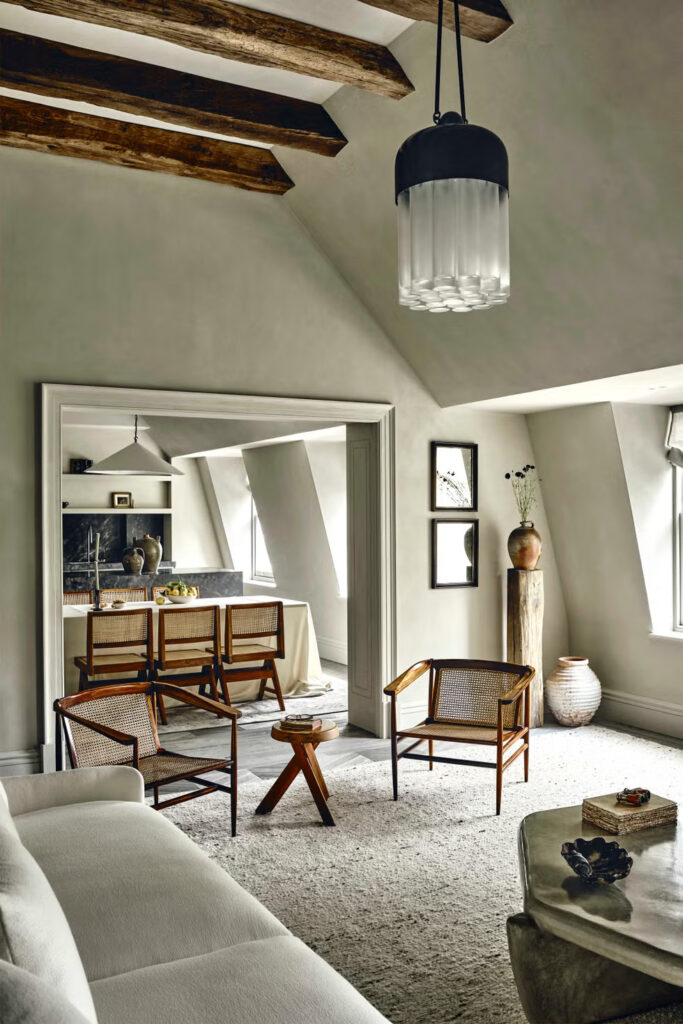 Οι επιρροές Wabi-sabi συναντούν την ήσυχη πολυτέλεια σε αυτό το γαλήνιο ρετιρέ του Λονδίνου. Έργο του Edoardo Mapelli Mozzi, ιδρυτή της Banda, η ομορφιά της ατέλειας είναι ορατή σε όλο τον χώρο από «τα δακτυλικά αποτυπώματα του κατασκευαστή στο κρεμαστό φωτιστικό πάνω από το τραπέζι», επισημαίνει, και τις αυθεντικές καρέκλες Pierre Jeanneret, οι οποίες προήλθαν από το έργο του αρχιτέκτονα στο Chandigarh στην Ινδία. «Μπορείτε να δείτε πού χρησιμοποιήθηκαν σε σχολεία και πανεπιστήμια. Έχουν βαθουλώματα και σημάδια. Το ίδιο ισχύει και για το μάρμαρο που έχουμε χρησιμοποιήσει σε όλο τον χώρο, αφηγείται την ιστορία εκατοντάδων και χιλιάδων ετών».