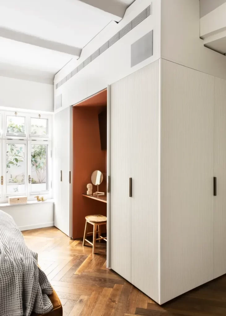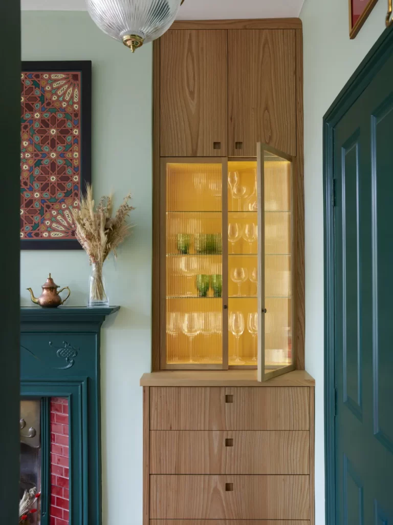 Η Leila προτείνει ακόμη και τη χρήση ραβδωτού γυαλιού στις πόρτες των ντουλαπιών για μεγαλύτερη εντύπωση όταν διακοσμείτε με χρώμα. Προσθέτει μεγαλύτερο βάθος στο σχέδιο, εξηγεί. «Κυριολεκτικά, υπάρχει χρώμα πίσω από τις πόρτες στο πίσω μέρος του ντουλαπιού, οπότε προσθέτει επίπεδα στο σχέδιο». Μια έντονη πινελιά χρώματος υψηλής αντίθεσης στο εσωτερικό μιας ντουλάπας έχει εξίσου μεγάλη δύναμη. Δημιουργεί μια παύση, μια οπτική στιγμή που θα τραβήξει την προσοχή και θα αναδείξει το προσωπικό σας στυλ.