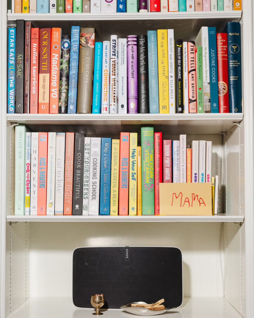 Στο ισόγειο, η παλέτα είναι λίγο πιο φωτεινή και απαλότερη, με αποχρώσεις του μπλε, του κίτρινου και άλλων χρωμάτων που προέρχονται από τα έπιπλα, τα έργα τέχνης και τα αντικείμενα στη βιβλιοθήκη. Στον επάνω όροφο, το ζευγάρι κράτησε τα πράγματα λίγο πιο απλά. Η παλέτα στην κρεβατοκάμαρα – μια σειρά από γήινες ουδέτερες αποχρώσεις – θέτει τον τόνο για κάθε χώρο που την πλαισιώνει: Η ντουλάπα περιλαμβάνει πολλά ασπρόμαυρα χρώματα, ώστε τα ρούχα να έχουν τη δική τους στιγμή να λάμψουν, ενώ το μπάνιο είναι βαμμένο με μια ζεστή βαφή ανθρακί που μιμείται ένα λάιμ. «Απλώς προσθέτει σε αυτή την μελαγχολική αίσθηση, ειδικά αν θυμηθούμε ότι όλο αυτό το μπάνιο ήταν κάποτε ένα ολόλευκο δωμάτιο» εξηγεί ο Fallis.