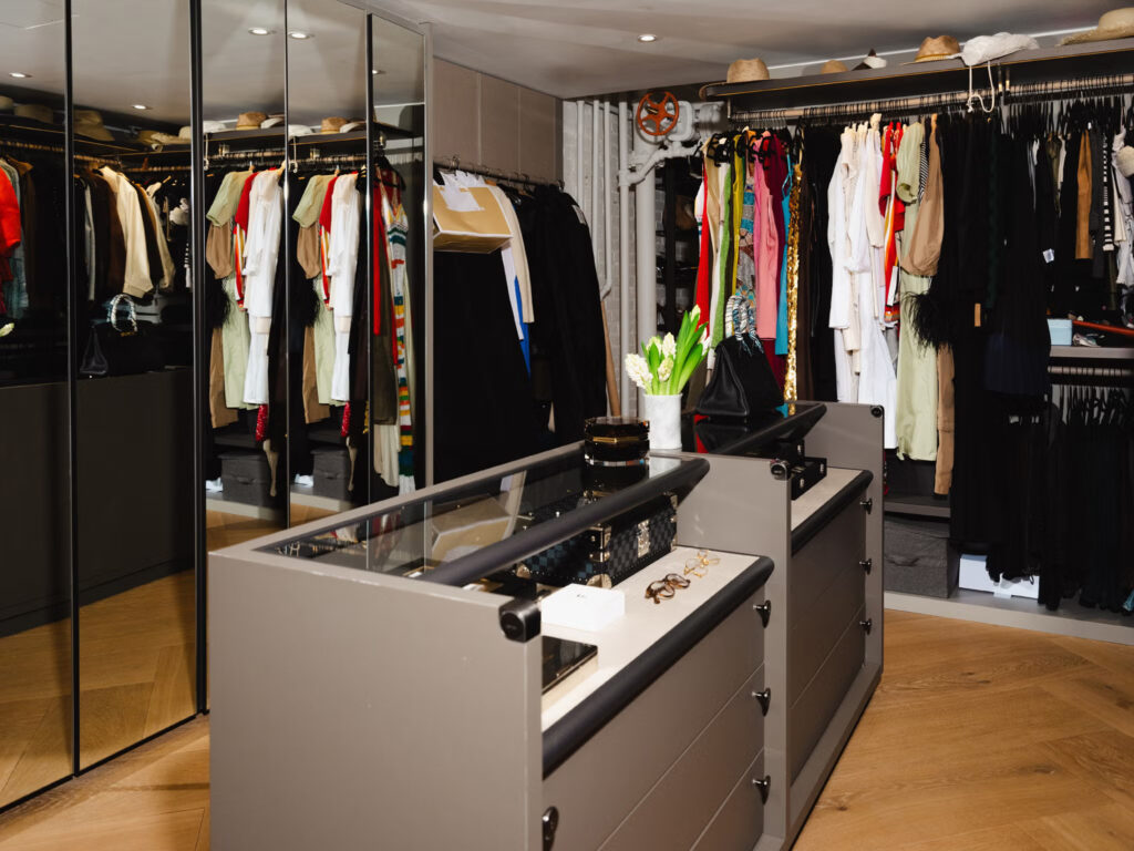 Τα μοναδικά αρχιτεκτονικά στοιχεία συνεχίζονται μέχρι την ελικοειδή σκάλα που οδηγεί κατευθείαν στο υπνοδωμάτιο του ζευγαριού, με ένα ευρύχωρο μπάνιο στη μία πλευρά και μια ακόμη μεγαλύτερη ντουλάπα στην άλλη. Ίσως το πιο cool πράγμα στο υπνοδωμάτιο είναι ο τοίχος απέναντι από το κρεβάτι, ο οποίος διαθέτει γυάλινα τζάμια από το δάπεδο μέχρι την οροφή που μπορούν να θολώσουν εντελώς με το πάτημα ενός κουμπιού. «Είναι ο ευκολότερος τρόπος για να έχετε ιδιωτικότητα εδώ πάνω» λέει ο Fallis. Από κάτω, μπορεί κανείς να διακρίνει μια σιλουέτα ή μια κίνηση, αλλά όχι πολλά άλλα όταν η ομίχλη είναι ενεργοποιημένη.