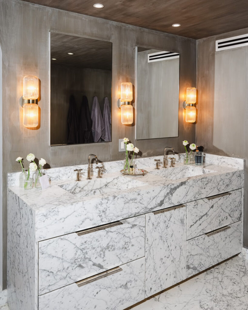 Επιπλέον, το ζευγάρι αποφάσισε να διακόψει το ανοιχτόχρωμο ξύλο που καλύπτει τα πατώματα σε όλο τον πρώτο όροφο, ώστε να μπορέσουν να επιλέξουν κάτι λίγο διαφορετικό, χωρίζοντας περαιτέρω την τραπεζαρία από τον χώρο του καθιστικού, μόλις ένα σκαλί πιο κάτω. «Το terazzo, σε αυτούς τους φυσικούς και απαλούς τόνους, διασπά το ξύλο που βλέπεις στο υπόλοιπο σπίτι» λέει η Bronfman. Συνδέεται επίσης τέλεια με το εντυπωσιακό και μελαγχολικό μαρμάρινο backsplash που καλύπτει τον τοίχο πάνω από ολόκληρο το μπαρ.