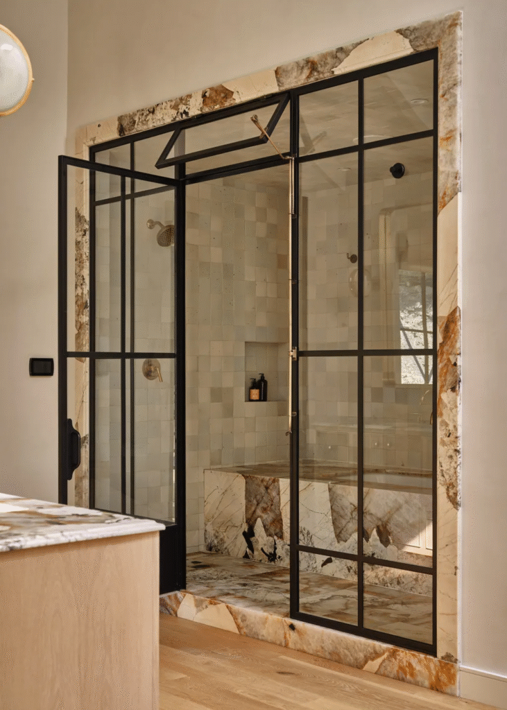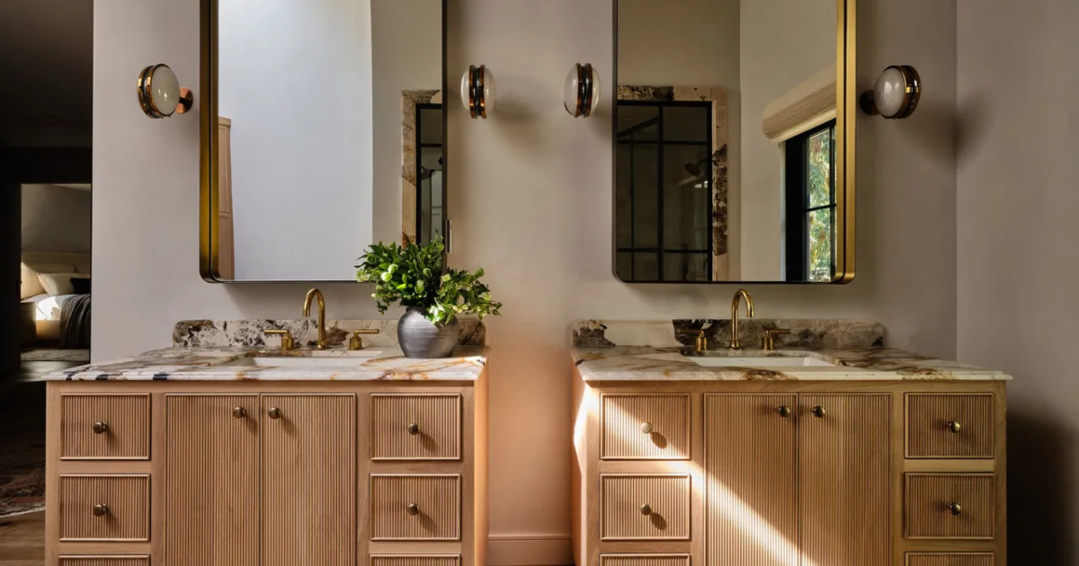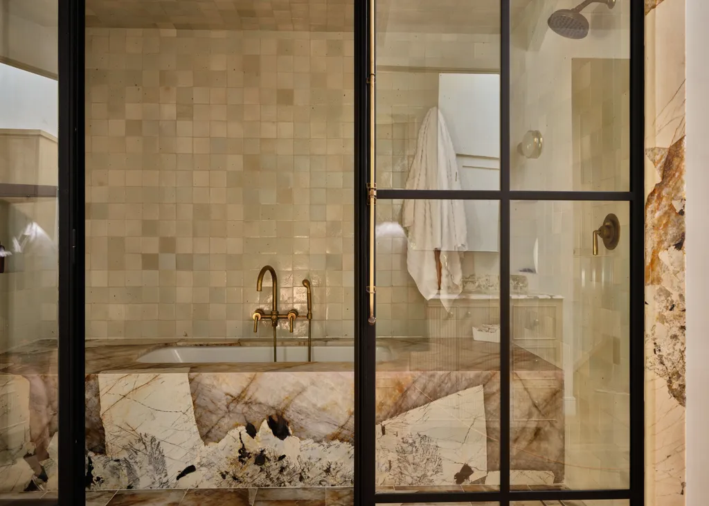 Επενδυμένο με μάρμαρο και γεμάτο φυσικό φως, αυτό το μπάνιο αποπνέει ένα κομψό καλιφορνέζικο στυλ, πιστό στην τοποθεσία του στο Λος Άντζελες. Αρχικά κατασκευασμένο τη δεκαετία του 1950, αυτό το σπίτι των μέσων του αιώνα δεν είχε σχεδόν καθόλου αγγιχτεί από τότε, με αποτέλεσμα να χρειάζεται κάποιες αρκετά σημαντικές ανακαινίσεις πριν μπορέσουν να μετακομίσει το νεαρό ζευγάρι που το είχε αγοράσει.