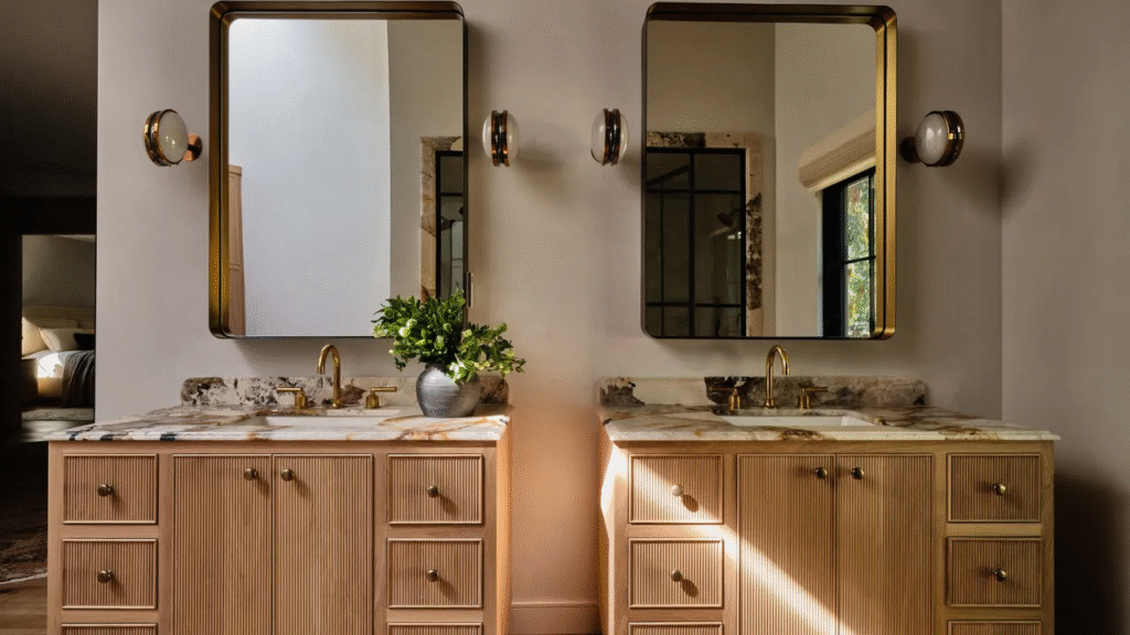 Καλώντας την Christie Ward και τον Staver Gray από την Ward + Gray, η ομάδα ξεκίνησε μια αποστολή να διατηρήσει τη γοητεία των μέσων του αιώνα που έκανε αυτό το σπίτι τόσο ξεχωριστό εξαρχής, εκσυγχρονίζοντάς το παράλληλα ώστε να ταιριάζει στον τρόπο ζωής αυτής της νεαρής οικογένειας – ένας στόχος που είναι τόσο σαφής σε αυτό το μοντέρνο μπάνιο όσο και σε όλο το υπόλοιπο σπίτι.