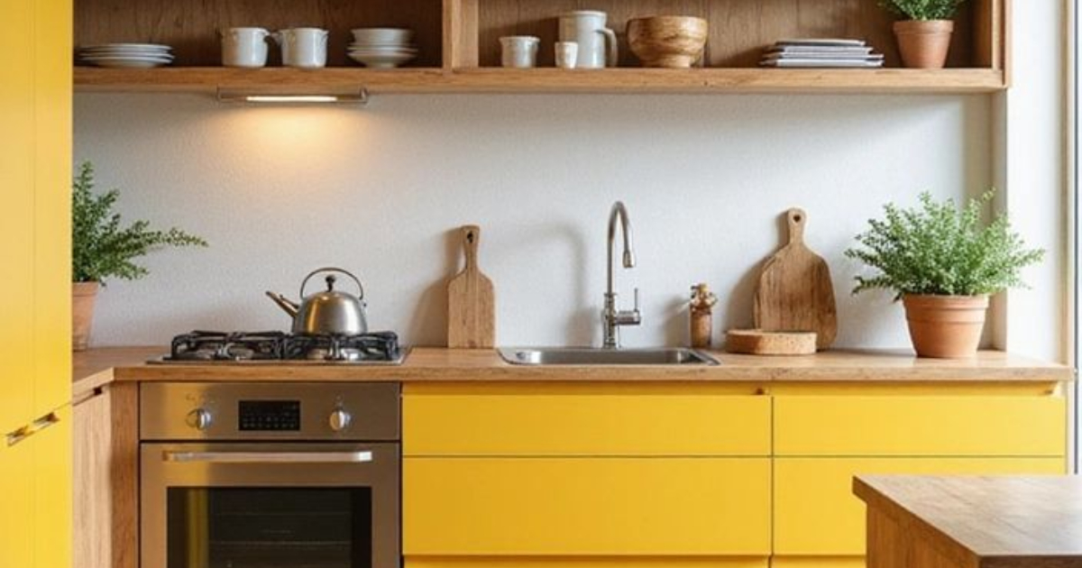 Το μυστικό εδώ κρύβεται στην ισορροπία των υλικών. Η επιλογή του φυσικού ξύλου στις επιφάνειες και τα ράφια λειτουργεί ως «γείωση» για το φωτεινό κίτρινο, προσθέτοντας μια οργανική ζεστασιά που εξισορροπεί τη μοντέρνα ένταση των ντουλαπιών. Η χρήση επίπεδων επιφανειών χωρίς πόμολα (handleless design) επιτρέπει στο χρώμα να μιλήσει από μόνο του. Αν υπήρχαν πολλά διακοσμητικά στοιχεία ή περίτεχνα χερούλια, το αποτέλεσμα θα έδειχνε «φορτωμένο». Τα ξύλινα ανοιχτά ράφια στο πάνω μέρος «σπάνε» τη μονοτονία του κίτρινου όγκου. Δίνουν βάθος στον τοίχο και επιτρέπουν στα καθημερινά αντικείμενα – όπως τα λευκά κεραμικά και τα φυτά – να λειτουργήσουν ως διακοσμητικά στοιχεία που ηρεμούν το μάτι.