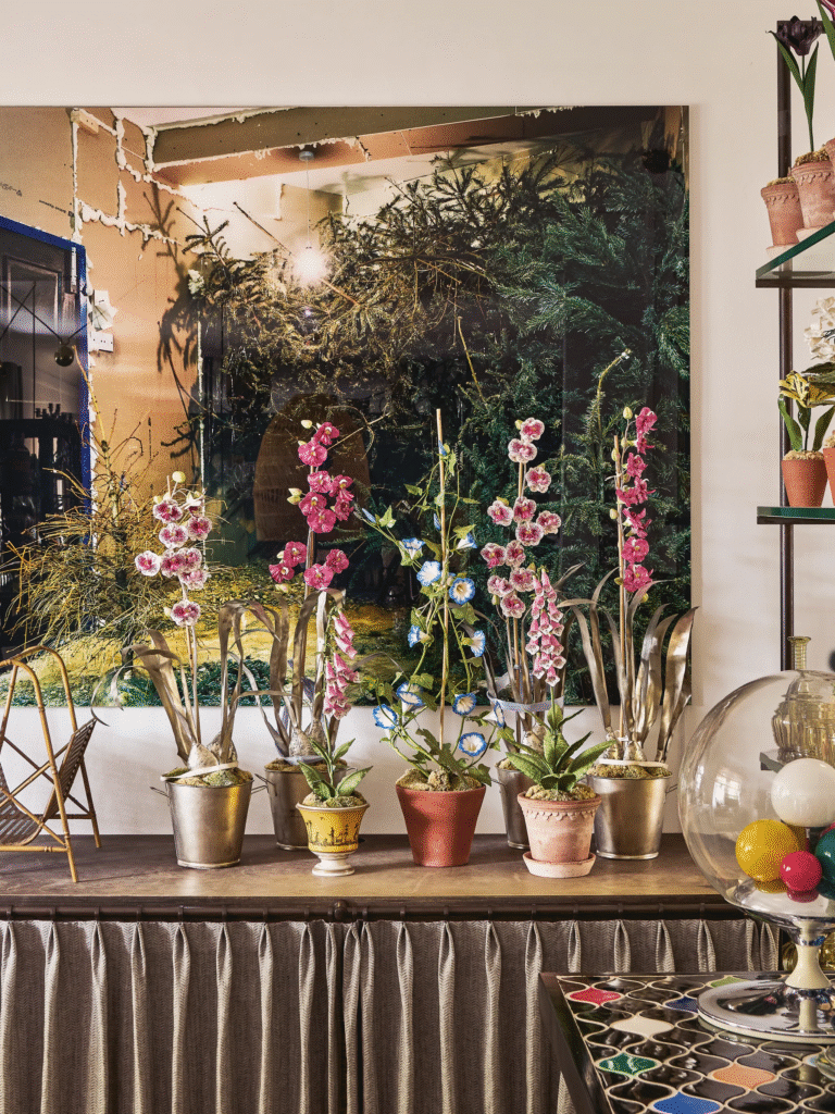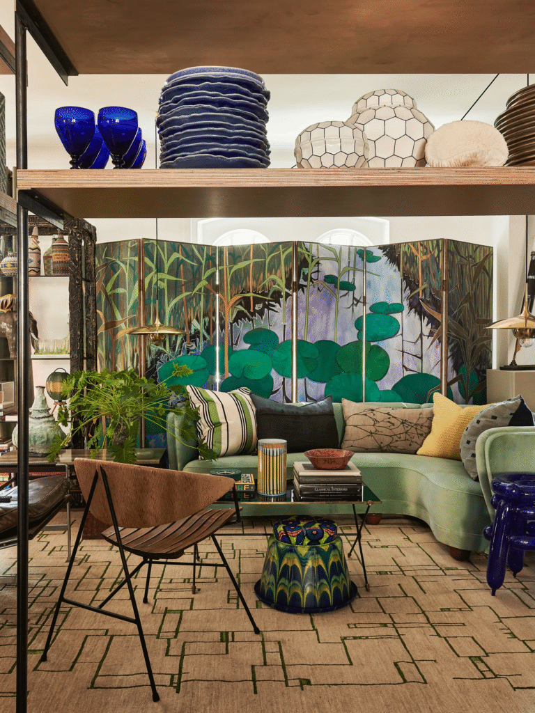 Αυτή η ρευστότητα είναι κεντρικής σημασίας για τον χαρακτήρα του χώρου. Είναι εν μέρει γκαλερί, εν μέρει mood board, με τις διατάξεις να αλλάζουν συνεχώς. «Εξετάσαμε τι είχαμε στην αποθήκη, αποφασίσαμε ποιους καναπέδες θα φέρουμε και χτίσαμε την ατμόσφαιρα από εκεί. Δουλεύω γρήγορα. Μόλις η ενέργεια είναι η σωστή, σταματάω. Αν το παρακάνεις, ισοπεδώνει τα πάντα».