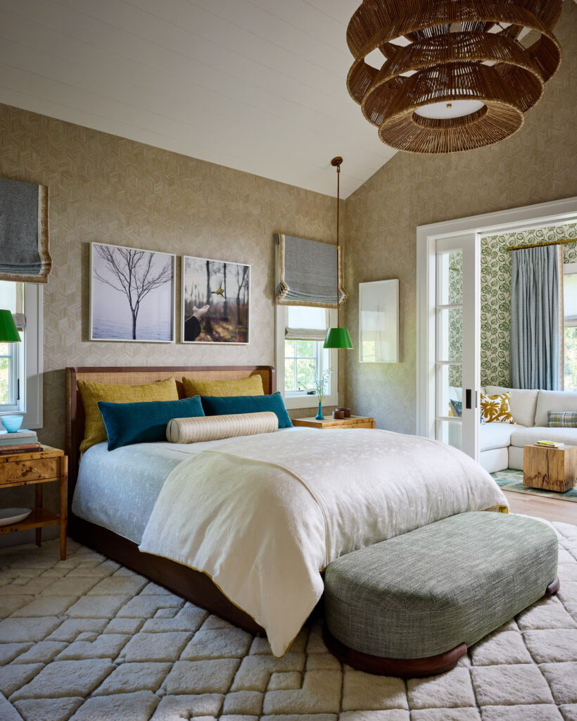 Για να διασφαλίσει ότι η χρωματική αφήγηση θα ρέει σε όλο το σπίτι, η Tenaglia βρήκε στιγμές επανάληψης, συχνά αντηχώντας την ίδια απόχρωση σε διάφορα δωμάτια και ακουμπώντας σε συμπληρωματικές παλέτες. Ένα επιβλητικό μπλε εμφανίστηκε στα ντουλάπια του δωματίου, στη συνέχεια εμφανίστηκε στην οροφή από σανίδες της τραπεζαρίας και ξανά στα ντουλάπια της κουζίνας. Ταπετσαρίες σε διάφορες γαλαζοπράσινες αποχρώσεις, από την είσοδο μέχρι το μπάνιο, ενίσχυσαν περαιτέρω αυτήν την αφήγηση. Τελικά, με υπομονή, εμπιστοσύνη και την Tenaglia στο τιμόνι, η νέα κατασκευή μετατράπηκε σε μια αξέχαστη χρωματική… Χώρα των Θαυμάτων.