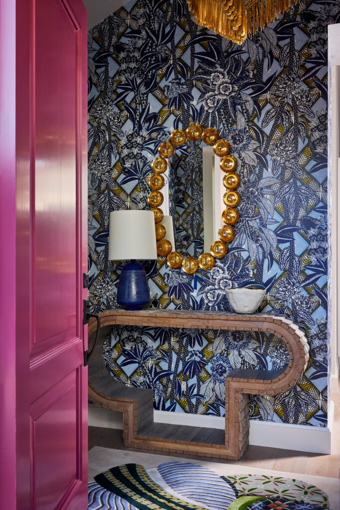 Ακόμα και πριν ξεκινήσουν οι εργασίες, η Tenaglia και η πελάτισσά της ήταν στο ίδιο μήκος κύματος, συμφωνώντας και οι δύο ότι τα έντονα χρώματα και τα ζωηρά μοτίβα ήταν απαραίτητα. Η πρόκληση για το σπίτι – που περιλαμβάνει δύο υπνοδωμάτια και δύο μπάνια – ήταν το πώς να υλοποιηθεί αυτό το απεριόριστο δημιουργικό όραμα σε διασυνδεδεμένα δωμάτια. «Το σαλόνι, η τραπεζαρία και η κουζίνα ρέουν όλα άψογα το ένα μέσα στο άλλο» λέει η Tenaglia. «Σχεδιάσαμε προσεκτικά μια αλληλεπίδραση πολυεπίπεδων μοτίβων, χρωμάτων και ποικίλων στυλ φωτισμού, ξεχωριστή αλλά αρμονική, τολμηρή αλλά ισορροπημένη».