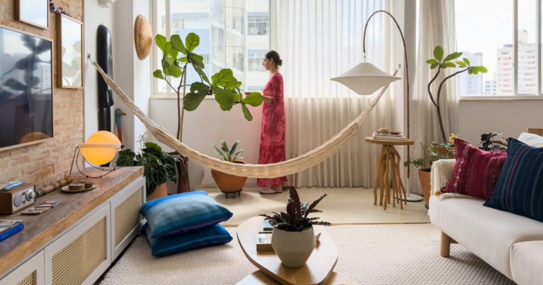 Ένας από τους πιο ιδιαίτερους χώρους είναι το σαλόνι, όπου δημιούργησε ένα είδος εσωτερικής βεράντας, με πολλά φυτά, μια αιώρα, γλυπτά και μια υπέροχη ατμόσφαιρα φωλιάς. Το γραφείο είναι άνετο και λειτουργικό, δείχνοντας πώς είναι δυνατόν να εργάζεσαι από το σπίτι με άνεση και προσωπικότητα. Η κρεβατοκάμαρα είναι εξαιρετικά ήσυχη, σχεδιασμένη για πραγματική ξεκούραση.