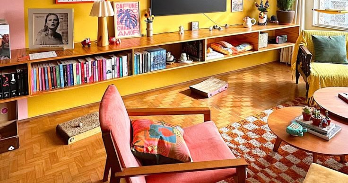 Το συγκεκριμένο σαλόνι αποπνέει μια αίσθηση ζεστασιάς και δημιουργικότητας, παρά το σχετικά μικρό του μέγεθος. Ο χώρος είναι οργανωμένος με τρόπο που εκμεταλλεύεται κάθε γωνιά, ενώ τα έντονα χρώματα δίνουν ζωή και ενέργεια στο δωμάτιο. Ιδιαίτερα εντυπωσιακό είναι το έντονο κίτρινο τμήμα του τοίχου πίσω από την τηλεόραση και η μακριά ξύλινη βιβλιοθήκη. Το κίτρινο λειτουργεί σαν φωτεινό φόντο που αναδεικνύει τα διακοσμητικά αντικείμενα, τα βιβλία και τα κάδρα. Τα πολύχρωμα εξώφυλλα των βιβλίων και οι καλλιτεχνικές αφίσες προσθέτουν επιπλέον ζωντάνια, δημιουργώντας ένα σκηνικό γεμάτο προσωπικότητα. Τα έπιπλα έρχονται να συμπληρώσουν αυτή την παιχνιδιάρικη παλέτα, με την κόκκινη πολυθρόνα να δίνει μια αίσθηση άνεσης, ενώ το χαλί με το καρό μοτίβο σε κόκκινες και κρεμ αποχρώσεις προσθέτει υφή και κίνηση στο πάτωμα.