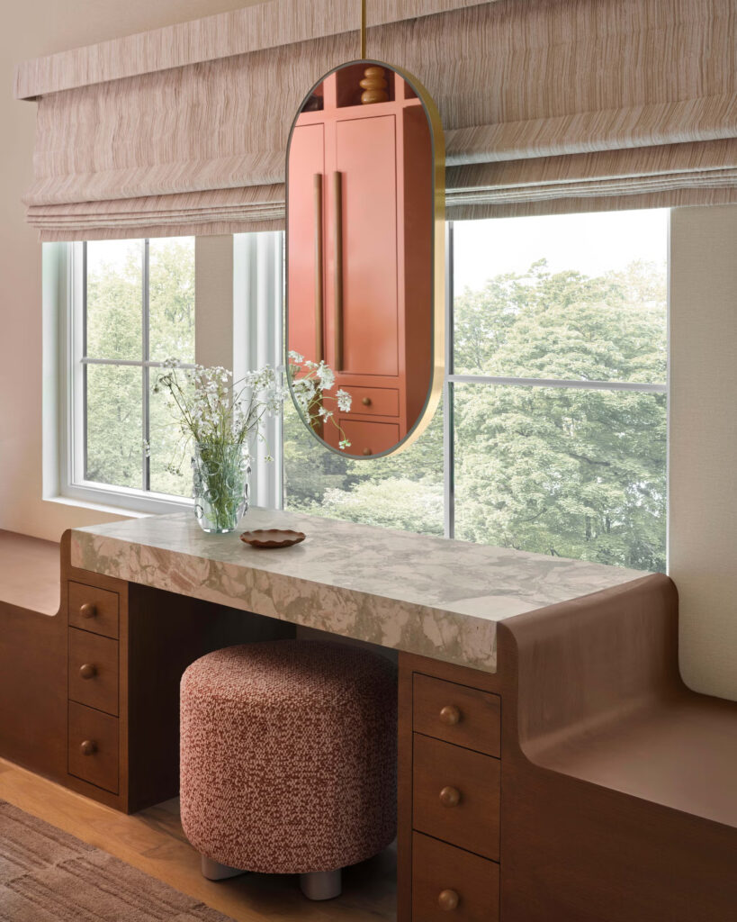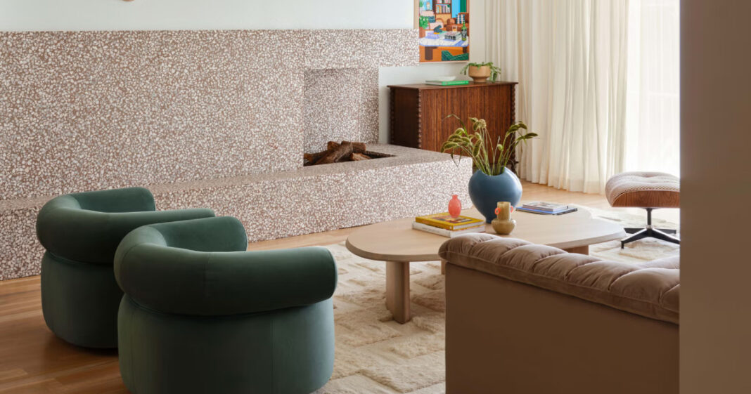 Το τζάκι στο επίσημο σαλόνι ήταν ένα άλλο ευαίσθητο σημείο για τους ιδιοκτήτες σπιτιών – οι εντοιχισμένες βιβλιοθήκες που το πλαισιώνουν ήταν περιφρονημένες από τον πελάτη. «Ήθελε μια καθαρή εμφάνιση και κάτι που δεν χρειαζόταν να γεμίσει με άσκοπα αντικείμενα και ακαταστασία» εξηγεί η σχεδιάστρια. Χρειάστηκαν μερικές επαναλήψεις, αλλά τους παρουσίασε ένα ασύμμετρο, καλυμμένο με μωσαϊκό περίβλημα τζακιού που γέμισε τον πελάτη με ενθουσιασμό. Η αφαίρεση των εντοιχισμένων ραφιών έδωσε νέα πνοή. Η Rojas το μετέτρεψε σε πιο σύγχρονο, επιλέγοντας ένα ασύμμετρο σχέδιο καλυμμένο με terrazzo, χειροποίητο με ένα μείγμα από μόκα, ροζ και μαρμάρινα κομμάτια Carrara. Είναι ασφαλές να πούμε ότι ο σχεδιασμός ξεπέρασε τα αρχικά renderings.