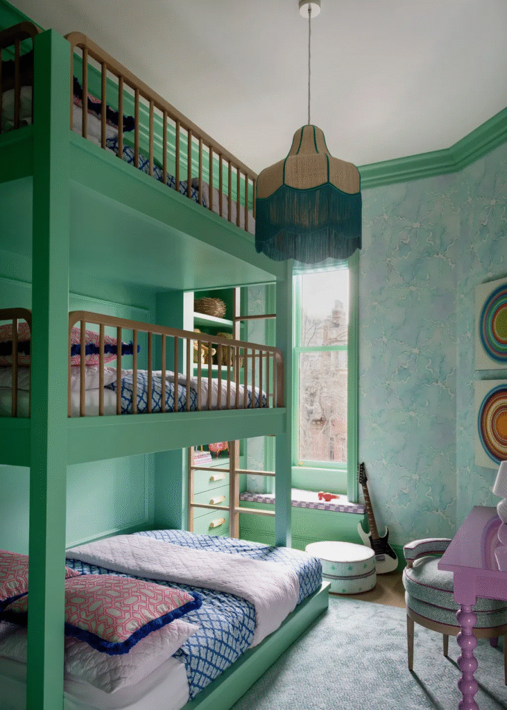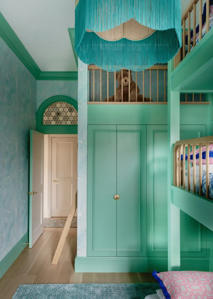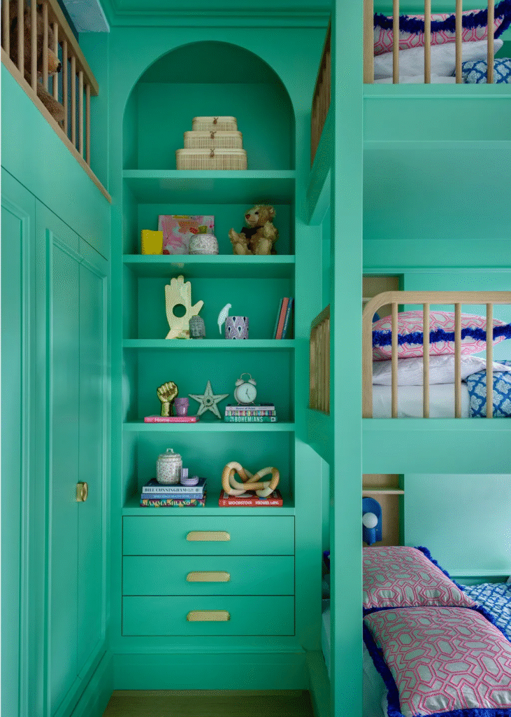 Το δωμάτιο με την κουκέτα είναι «σκόπιμα πιο τολμηρό και παιχνιδιάρικο από το υπόλοιπο σπίτι» λέει η Cara για τον αγαπημένο της χώρο στο έργο. «Είμαι λάτρης των χρωμάτων και αυτό το δωμάτιο είναι απόλυτη χαρά. Βάψαμε όλα τα ξυλουργικά, συμπεριλαμβανομένων των εντοιχισμένων κρεβατιών, ένα αδιαμφισβήτητα ζωηρό πράσινο που καταφέρνει να είναι ταυτόχρονα φρέσκο ​​και ελαφρώς εκκεντρικό. Η φωτεινότητά του δίνει στο δωμάτιο μια ζωηρή, ενεργητική πινελιά. Οι λεπτομέρειες και η ζωντάνια του πράσινου σε αυτό το παιδικό υπνοδωμάτιο πραγματικά πυροδοτούν χαρά και κανένα εκατοστό του χώρου δεν μένει απαρατήρητο.