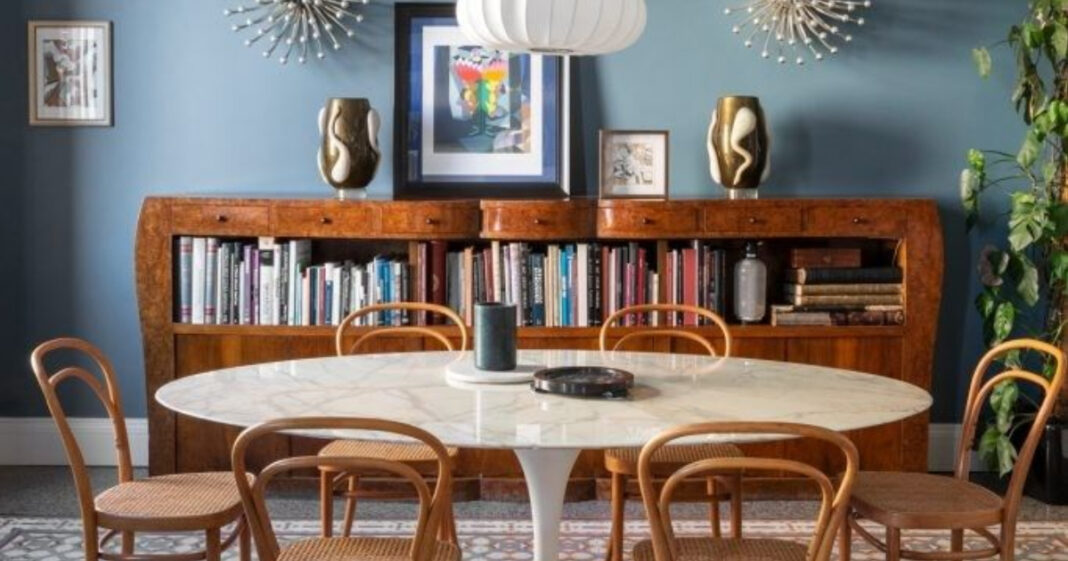 Η συγκεκριμένη, αποπνέει μια κομψή ισορροπία ανάμεσα στο κλασικό και το σύγχρονο, ιδανική για ένα διαμέρισμα που θέλει να ξεχωρίζει χωρίς υπερβολές. Στο κέντρο δεσπόζει ένα στρογγυλό τραπέζι με μαρμάρινη επιφάνεια και λευκή βάση, που δίνει μια αίσθηση καθαρότητας και φωτεινότητας στον χώρο. Γύρω του, οι ξύλινες καρέκλες με καμπυλωτές γραμμές και ψάθινα καθίσματα προσθέτουν ζεστασιά και φυσικότητα. Το φόντο ενισχύει τη συνολική αισθητική με έναν τοίχο σε βαθύ, γαλαζοπράσινο τόνο, που δημιουργεί μια ήρεμη αλλά εκλεπτυσμένη ατμόσφαιρα. Μια μακριά ξύλινη βιβλιοθήκη χαμηλού ύψους λειτουργεί τόσο πρακτικά όσο και διακοσμητικά, γεμάτη βιβλία και μικρά αντικείμενα τέχνης.