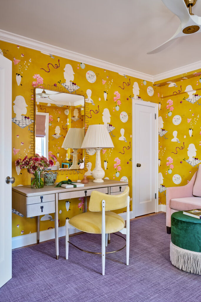 Σε όλο το υπόλοιπο σπίτι, η Stathis Lynch έφερε επιπλέον φωτεινά κίτρινα, αποχρώσεις λεβάντας, απαλά ροζ και φυσικά πράσινα. «Ο πελάτης ζήτησε το γραφείο, το οποίο λειτουργεί και ως δεύτερο υπνοδωμάτιο, να είναι ένας αναζωογονητικός χώρος με την ικανότητα να διεγείρει τη δημιουργικότητα» εξηγεί η designer.