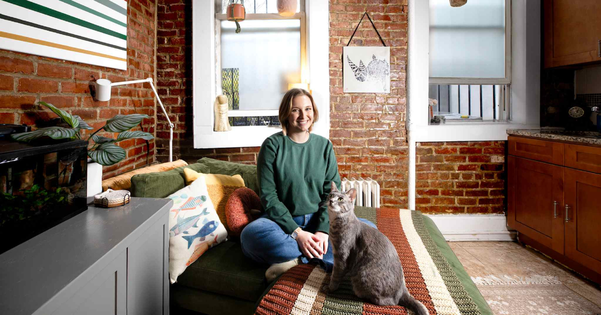 «Όταν πήρα τα κλειδιά, υπήρχαν άπειρα ημιτελή έργα γύρω από το σπίτι. Το χρώμα ήταν ανομοιόμορφο και με λεκέδες, χρειαζόταν καλό καθάρισμα και υπήρχαν λεκέδες σε όλους τους τοίχους από την ηλικιωμένη γάτα της προηγούμενης ενοίκου» ξεκινά η Emily Fischer, για το διαμέρισμα των 21 τετραγωνικών μέτρων που νοικιάζει εδώ και τεσσεράμισι χρόνια, και μοιράζεται με τις γάτες της, την Anya και τη Hallie.